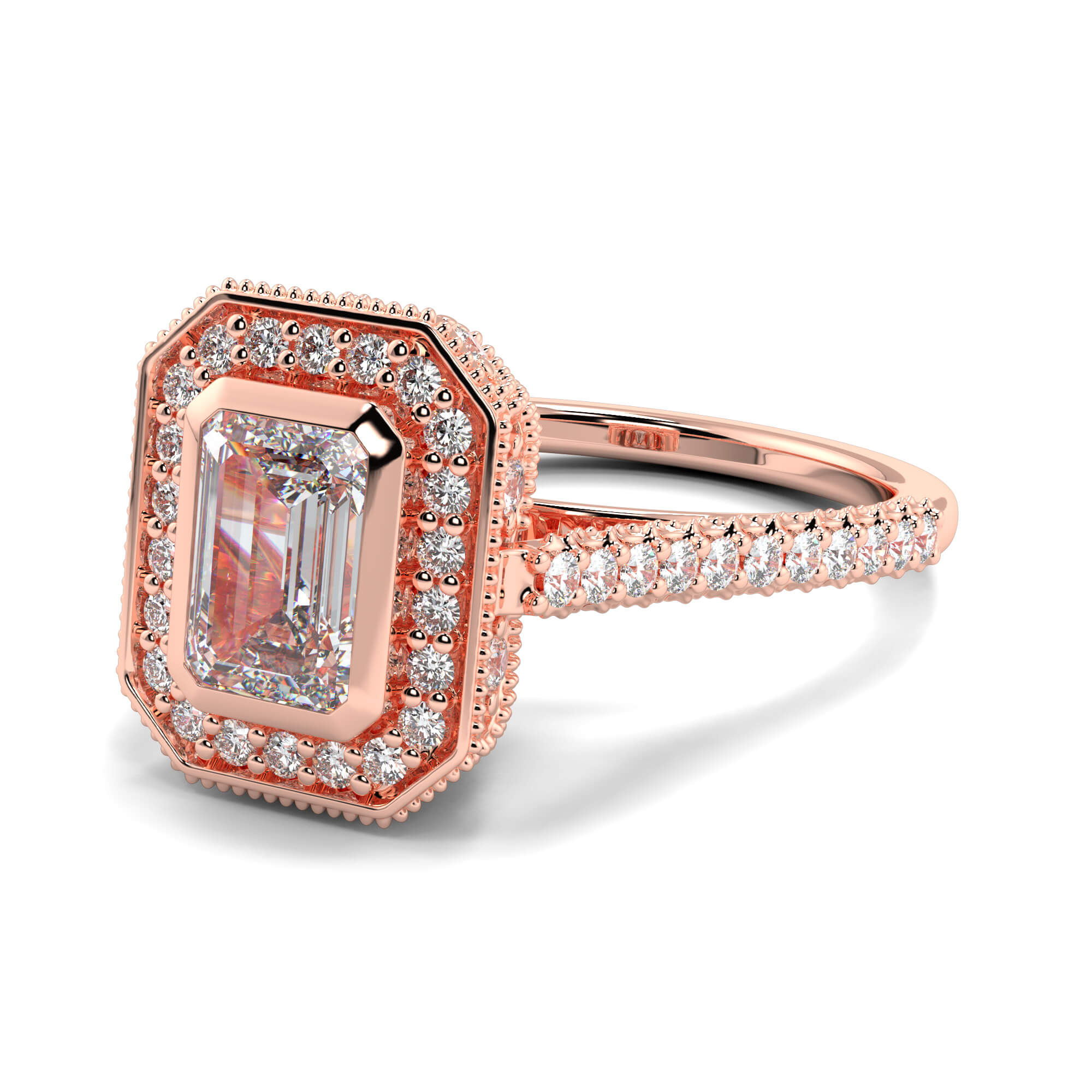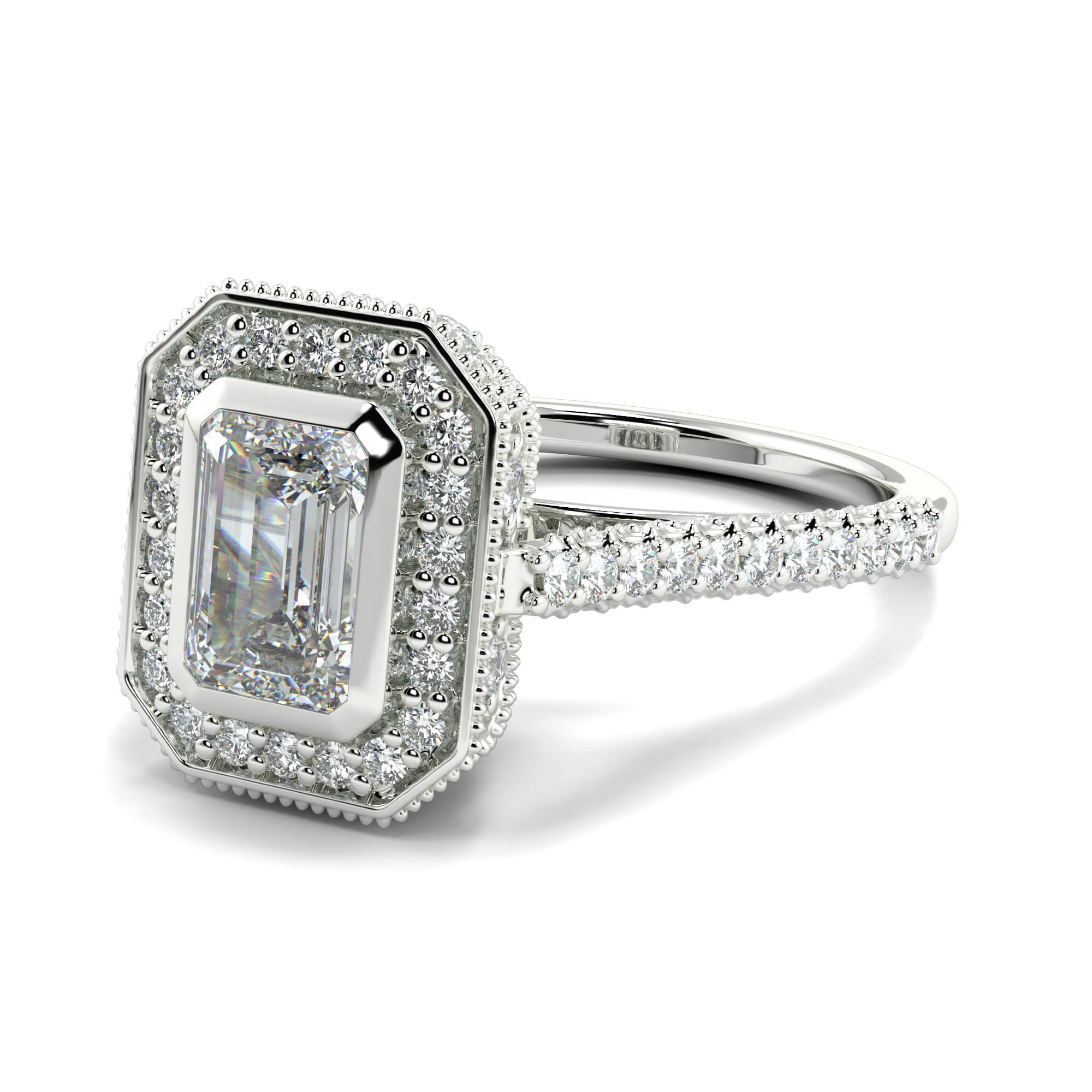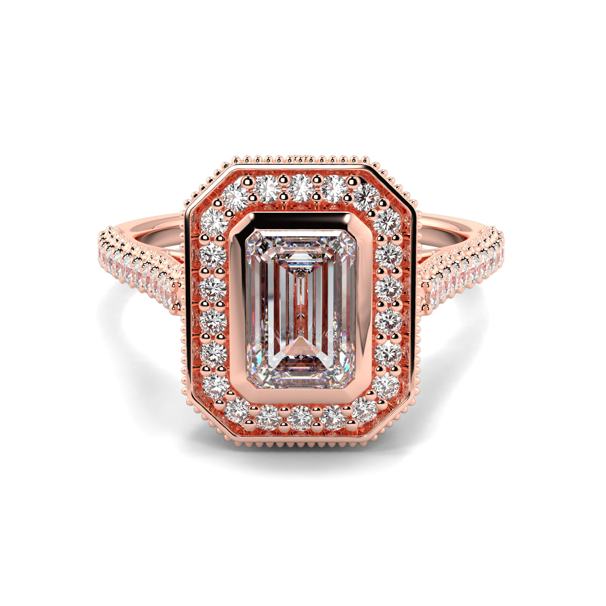 ” The tapered band draws attention to the emerald halo set wedding diamond ring center stone. Surprise diamonds sit at the base of the center stone for added artistry.