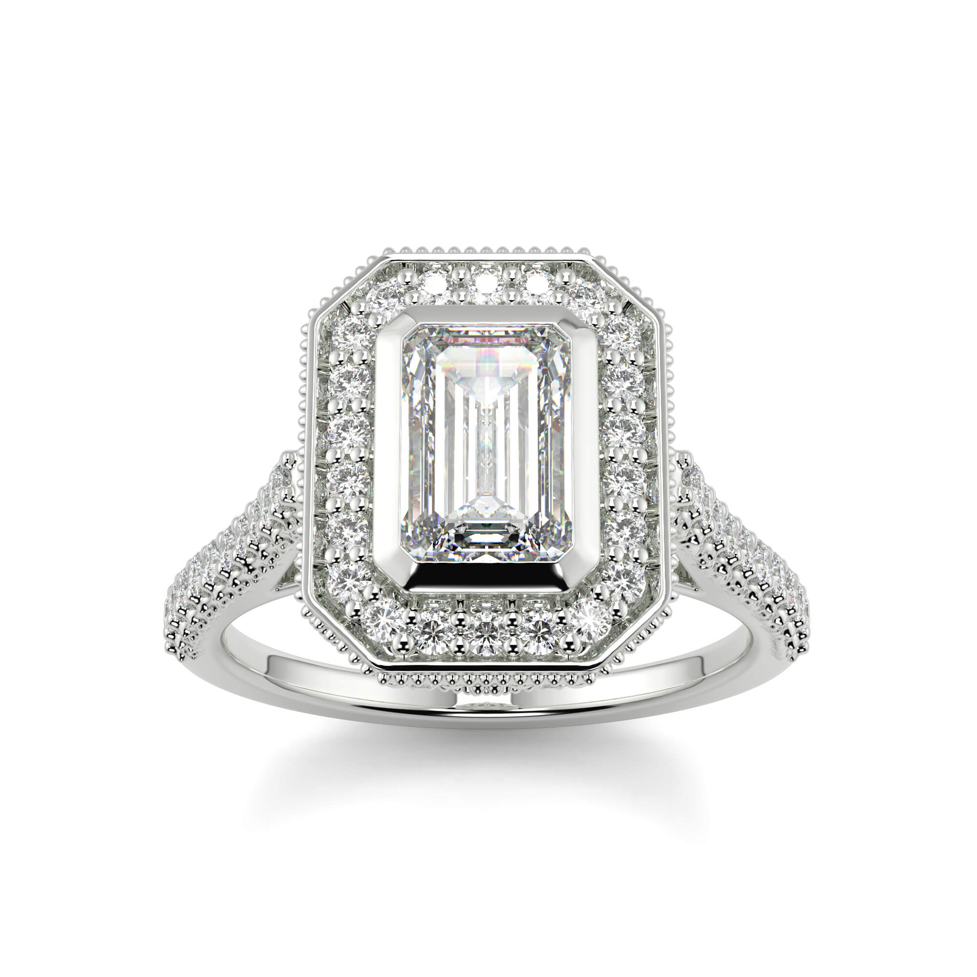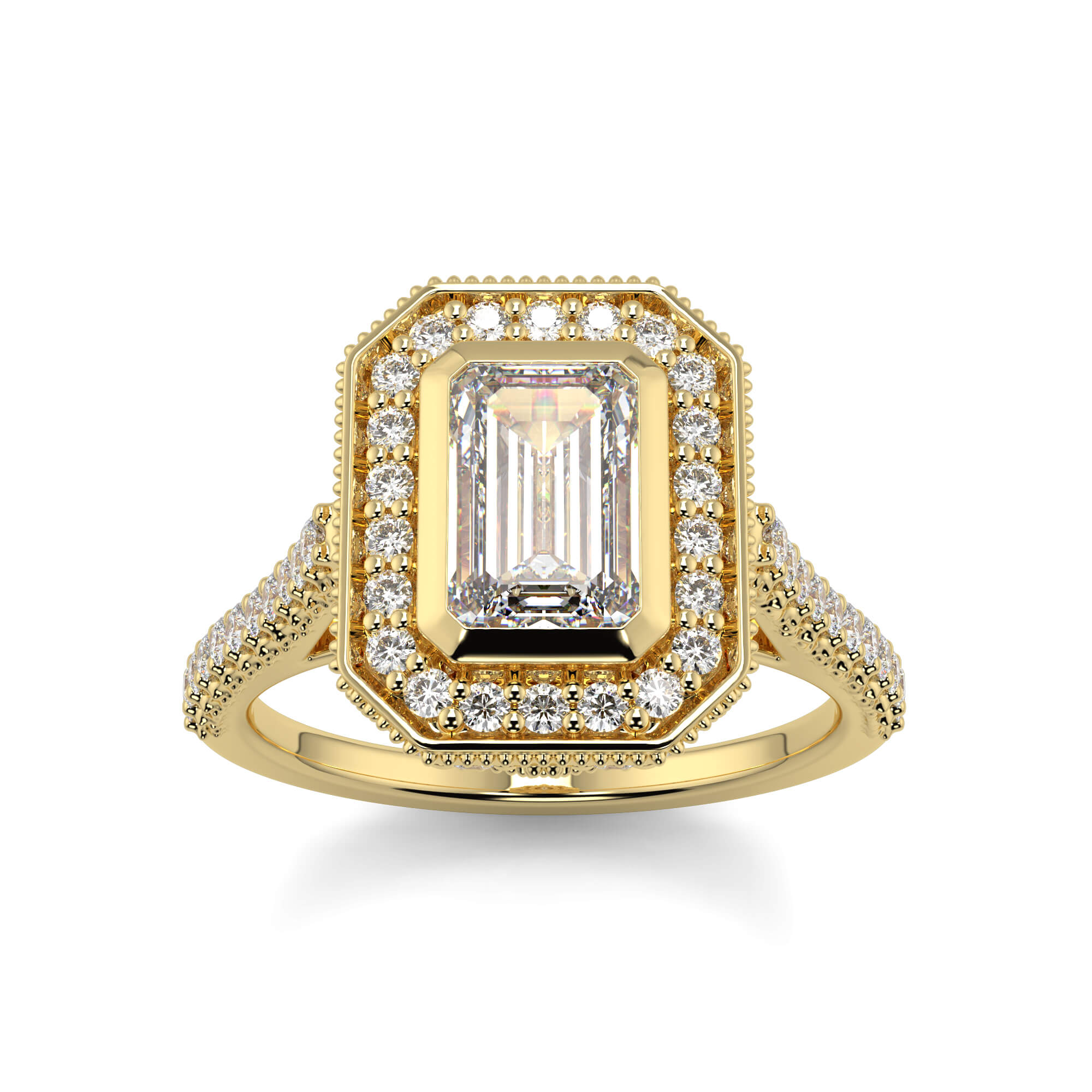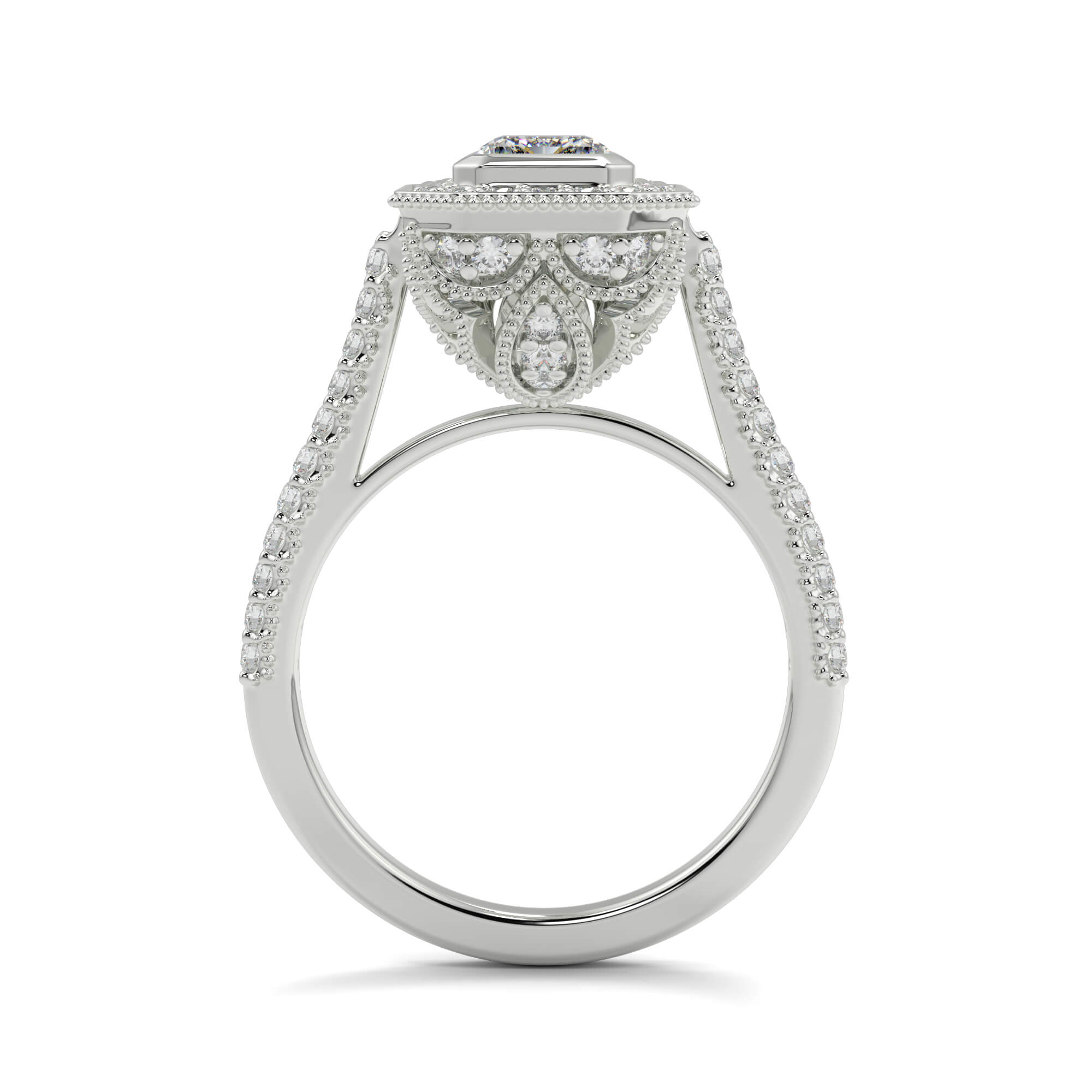 ” The tapered band draws attention to the emerald halo set wedding diamond ring center stone. Surprise diamonds sit at the base of the center stone for added artistry.