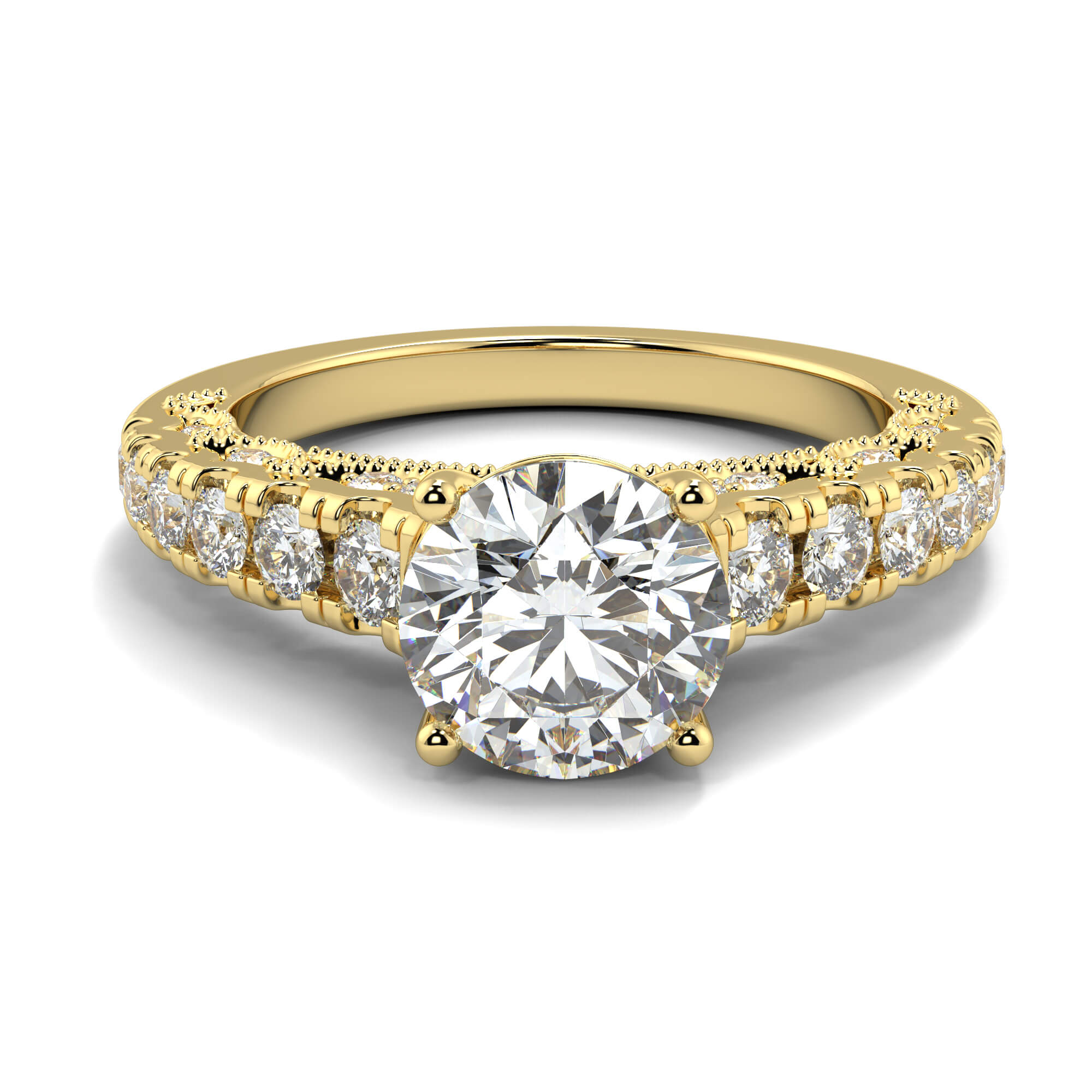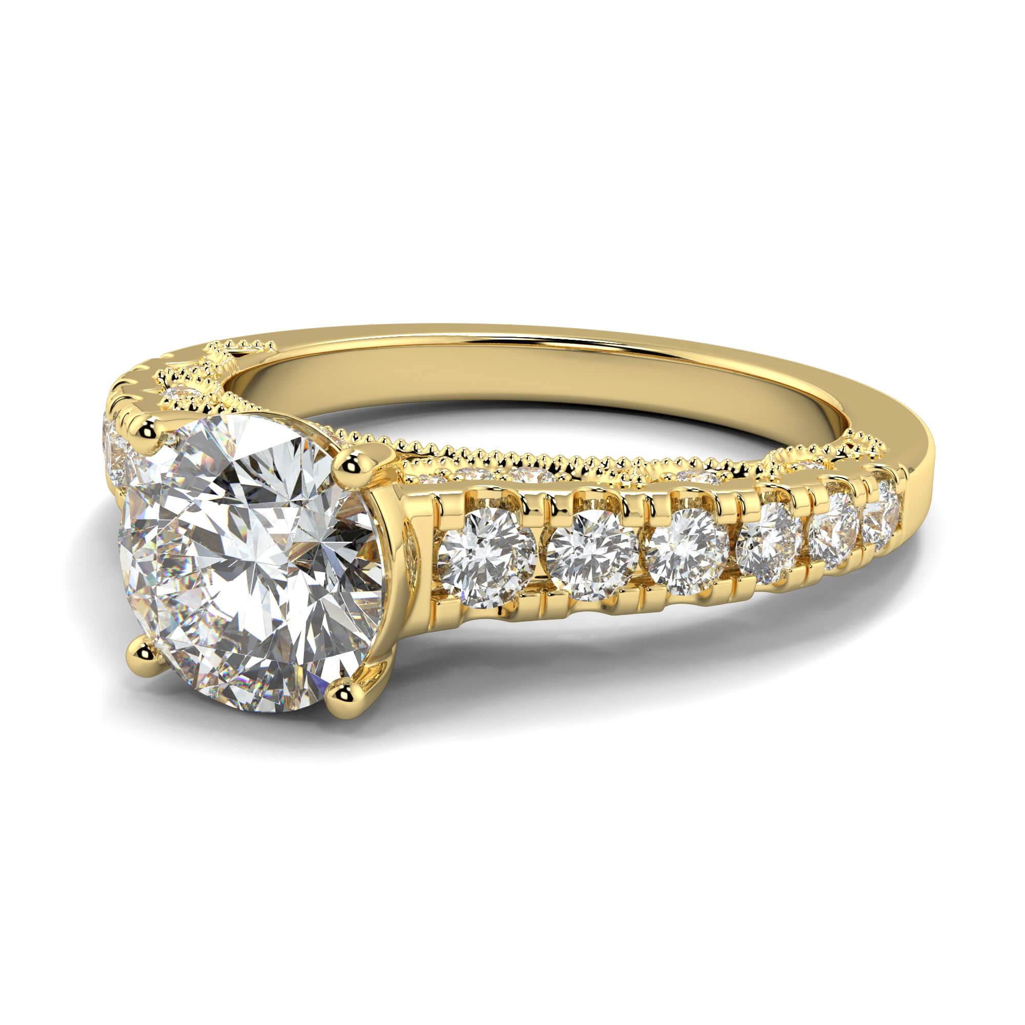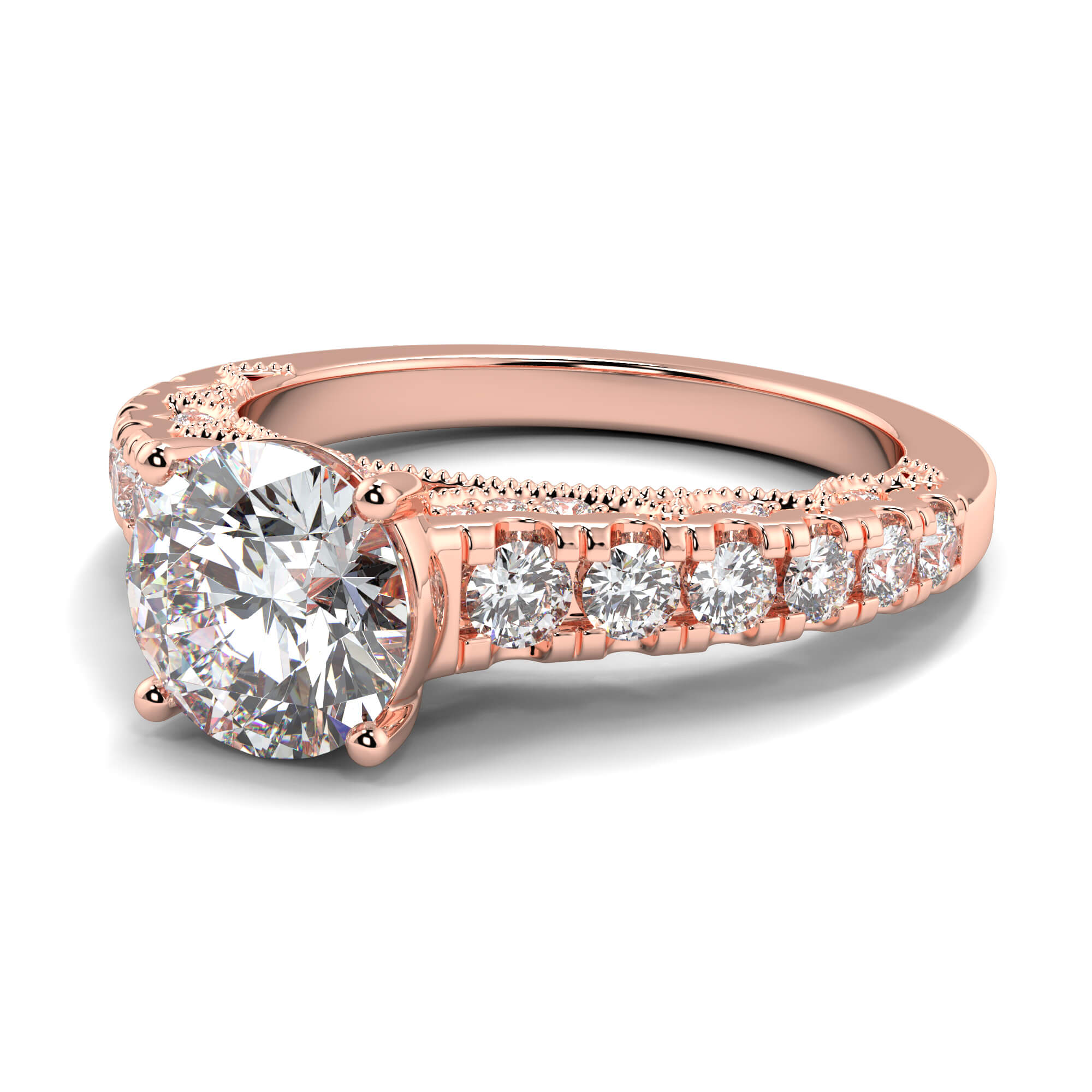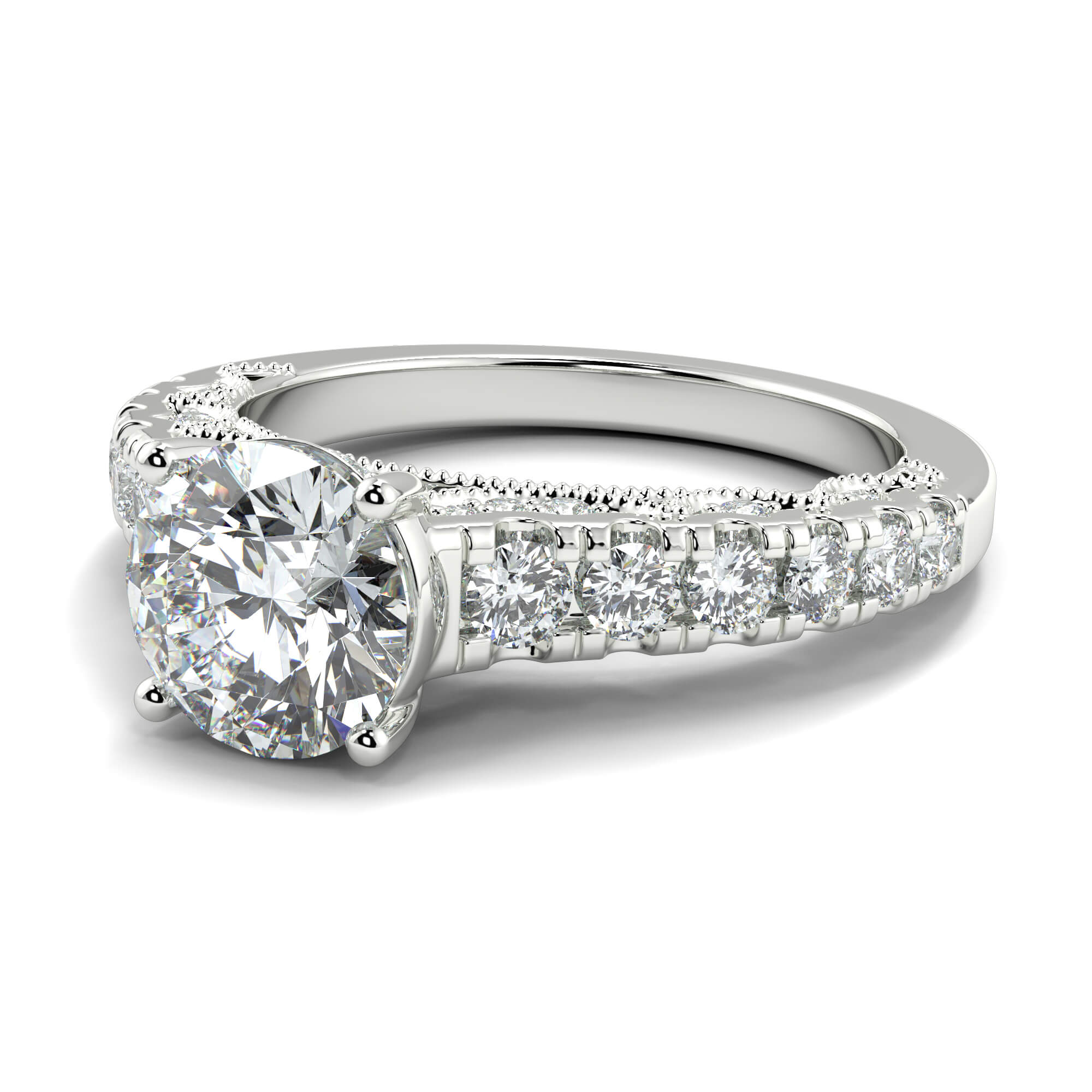 Similar to pavé setting, channel setting involves decorating the band of an round channel set diamond engagement ring with smaller diamonds.