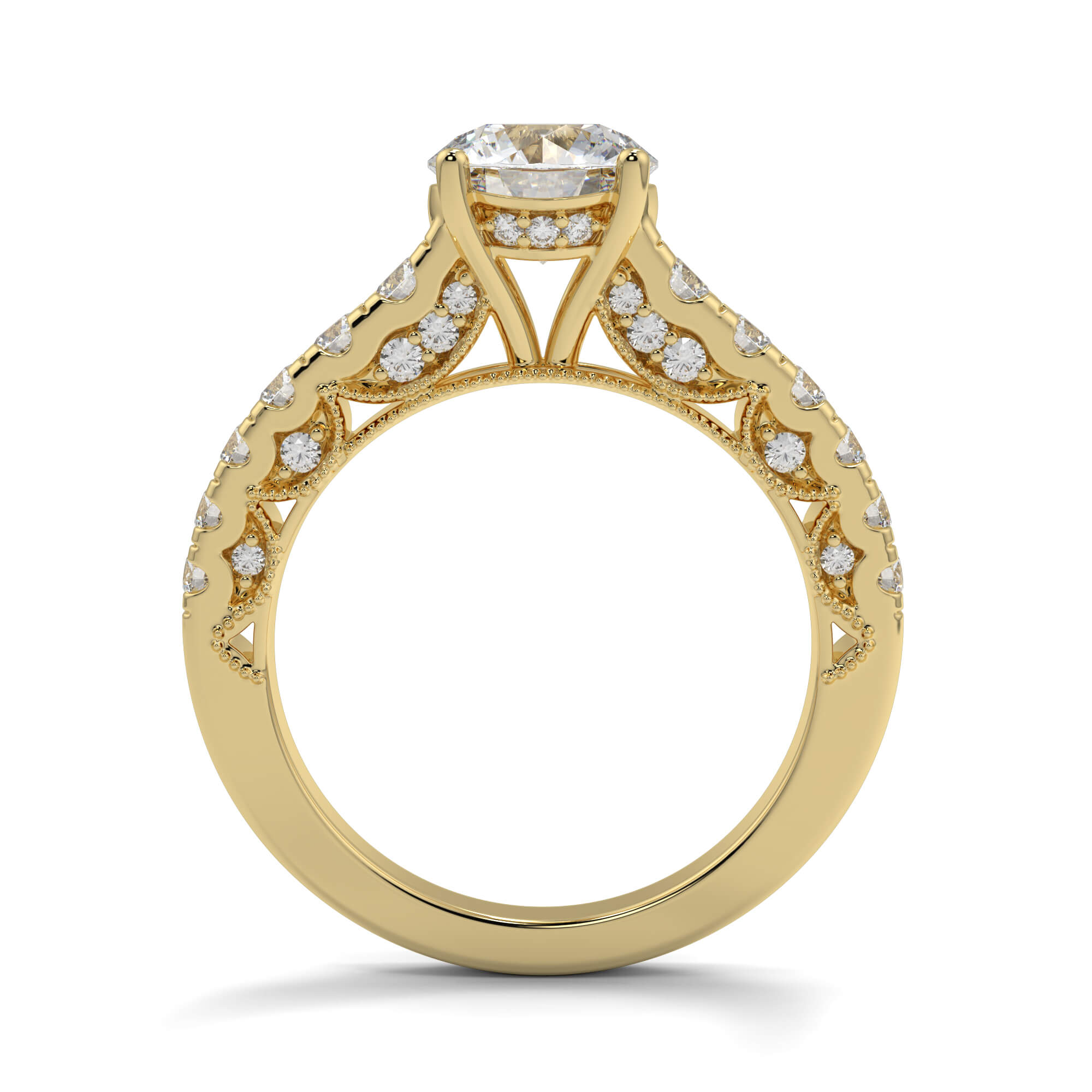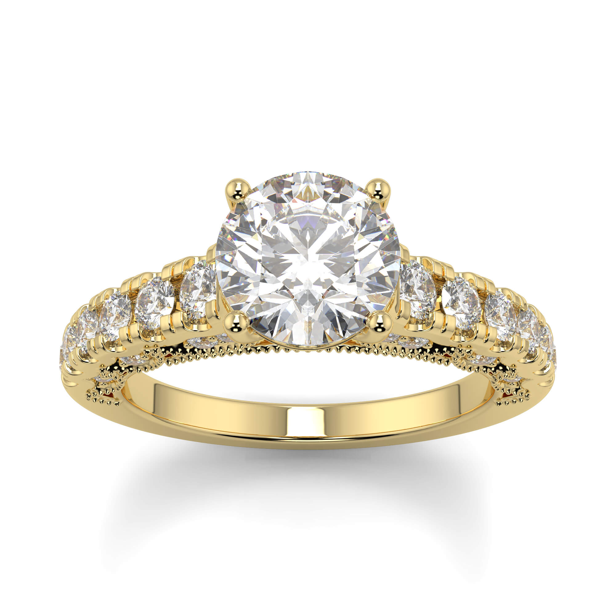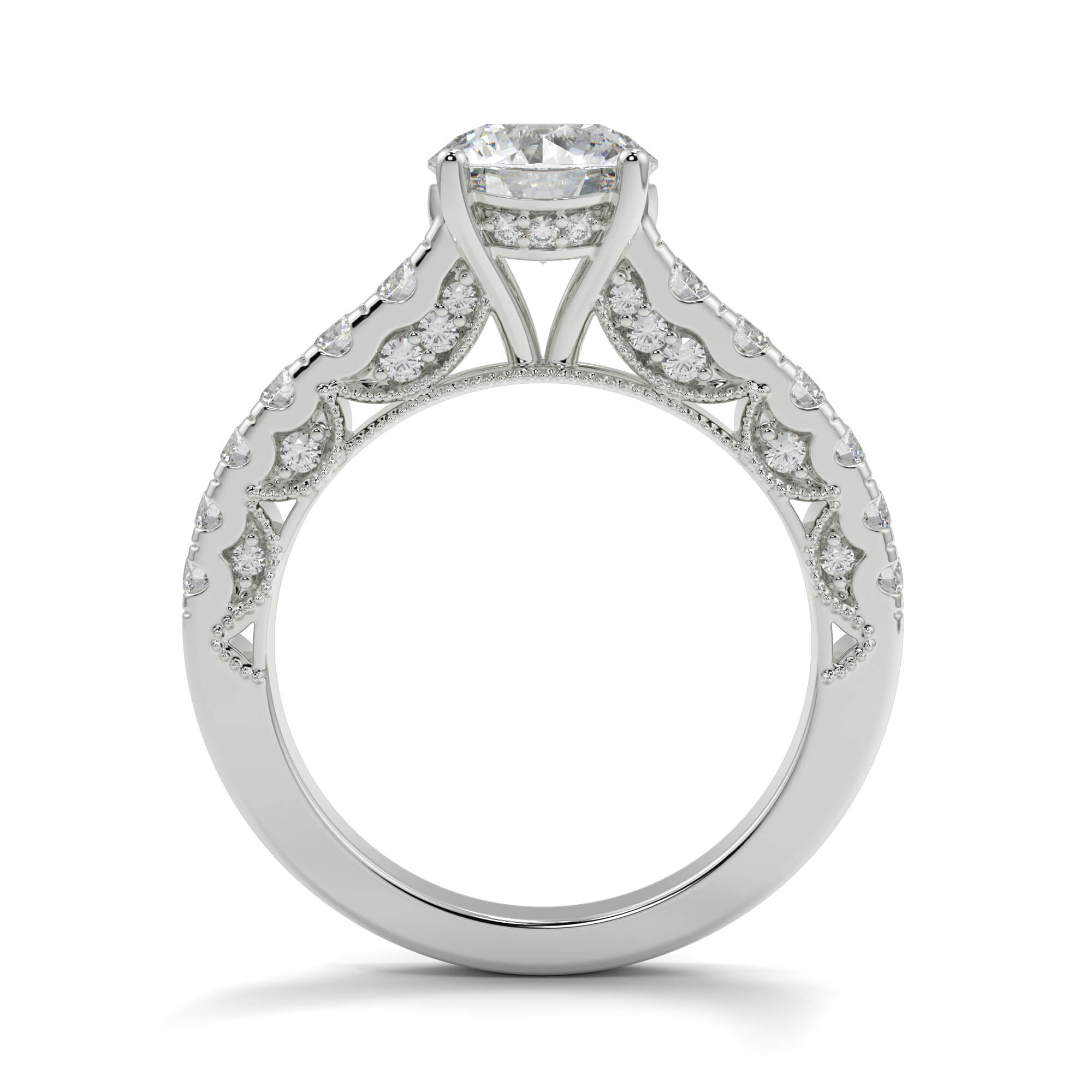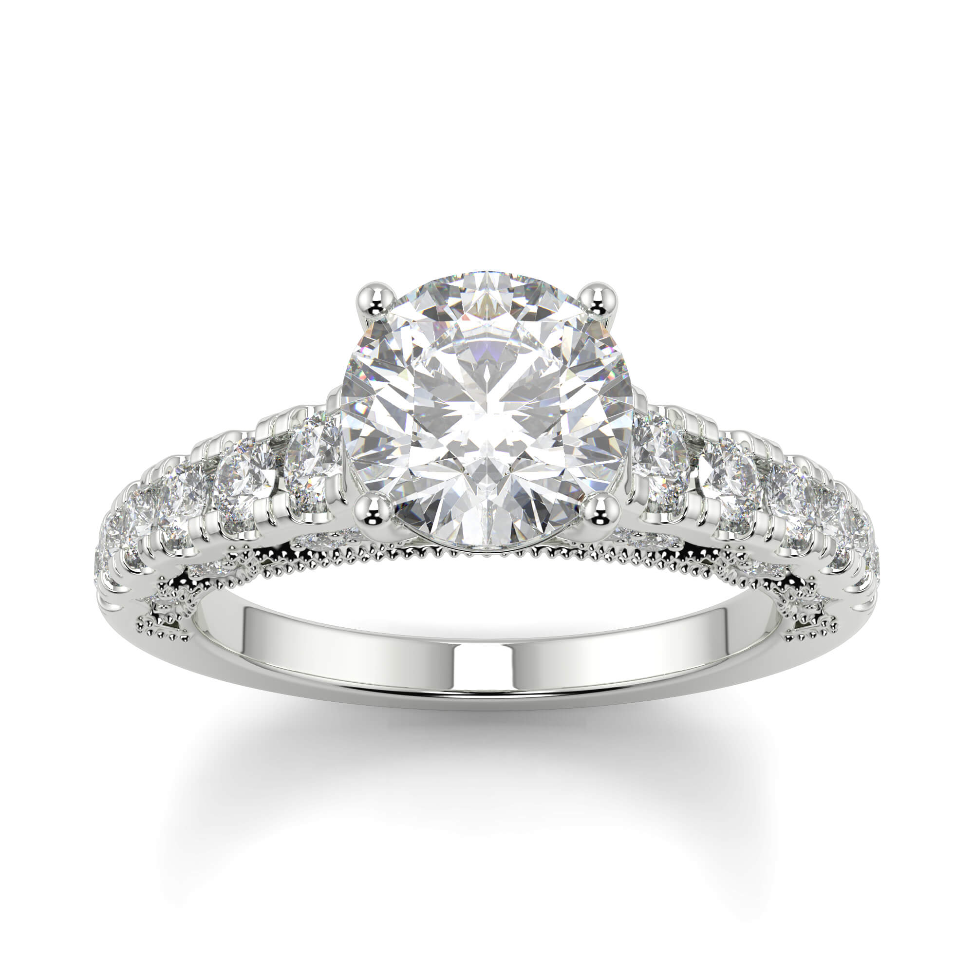 Similar to pavé setting, channel setting involves decorating the band of an round channel set diamond engagement ring with smaller diamonds.