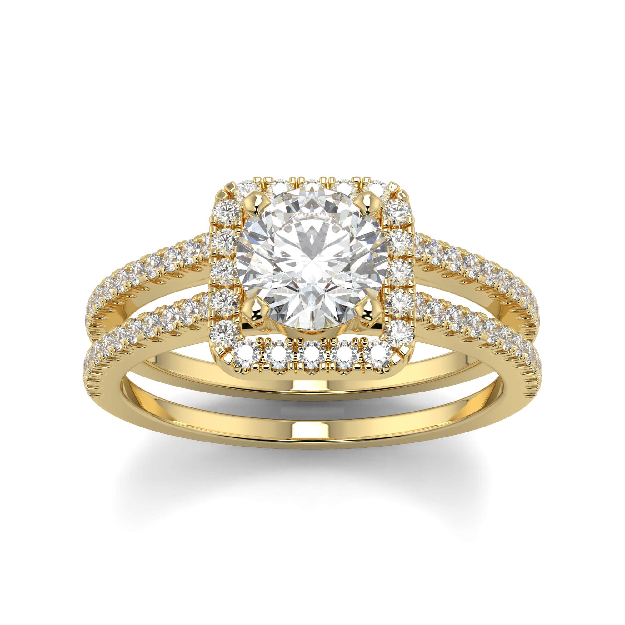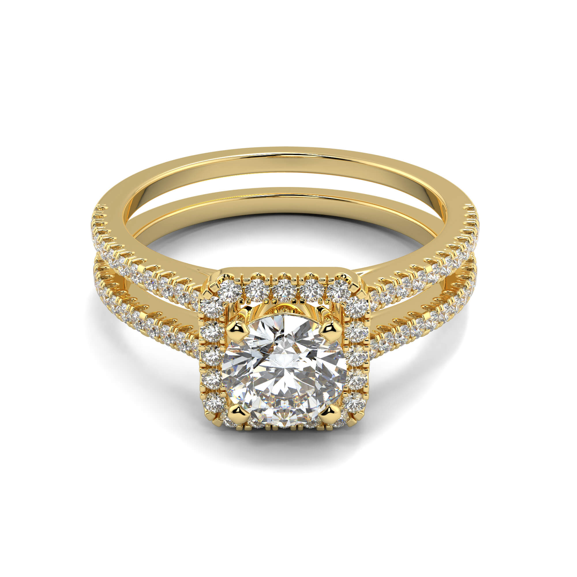 This round diamond square shape diamond ring bold band features white and yellow gold strands, decorated with brilliant pave diamonds.