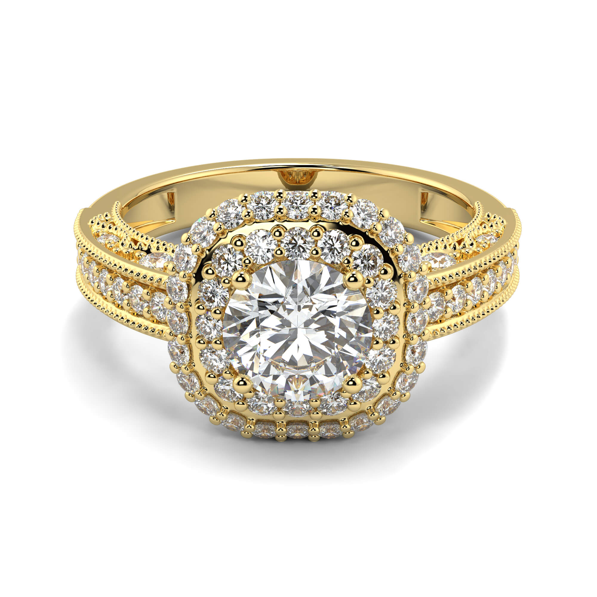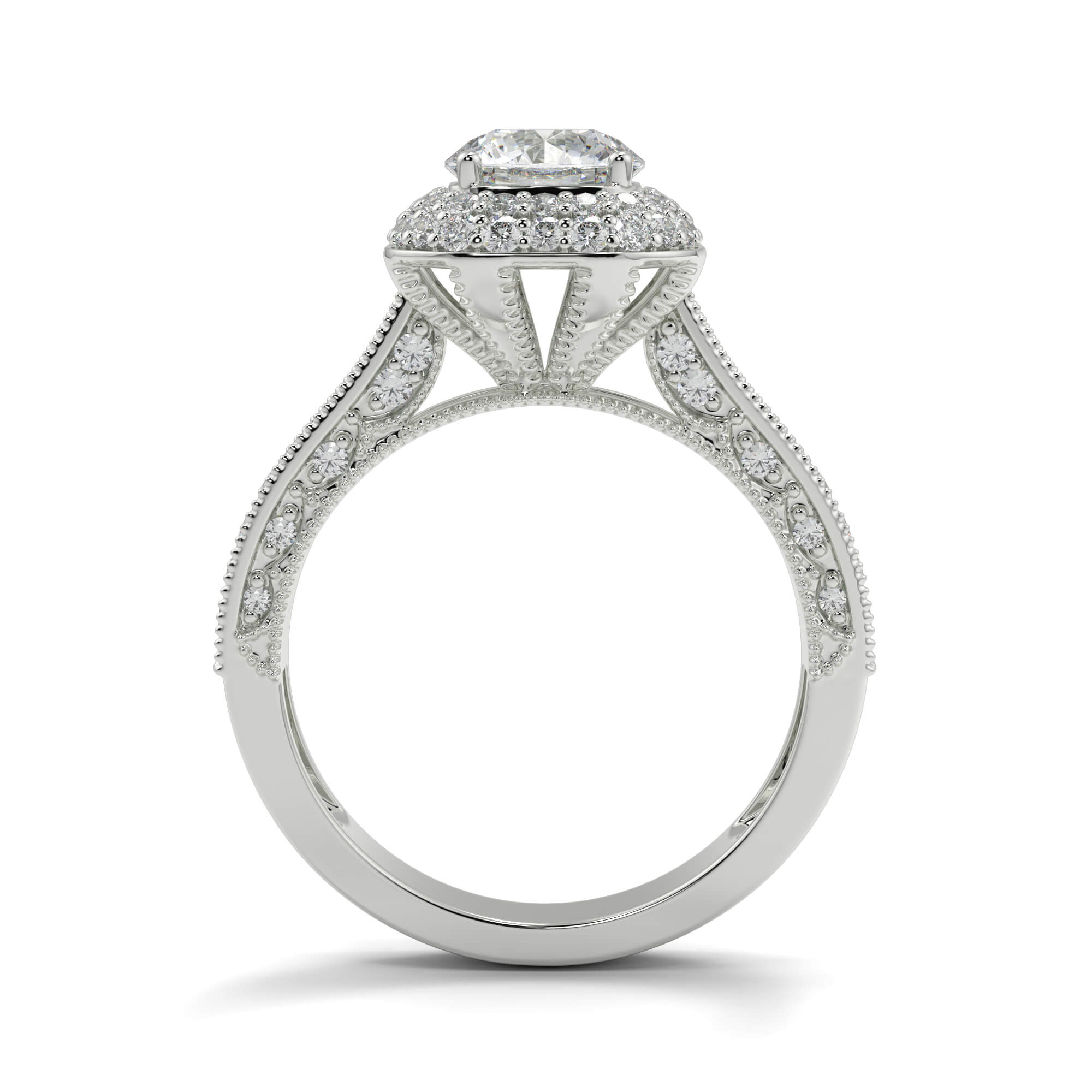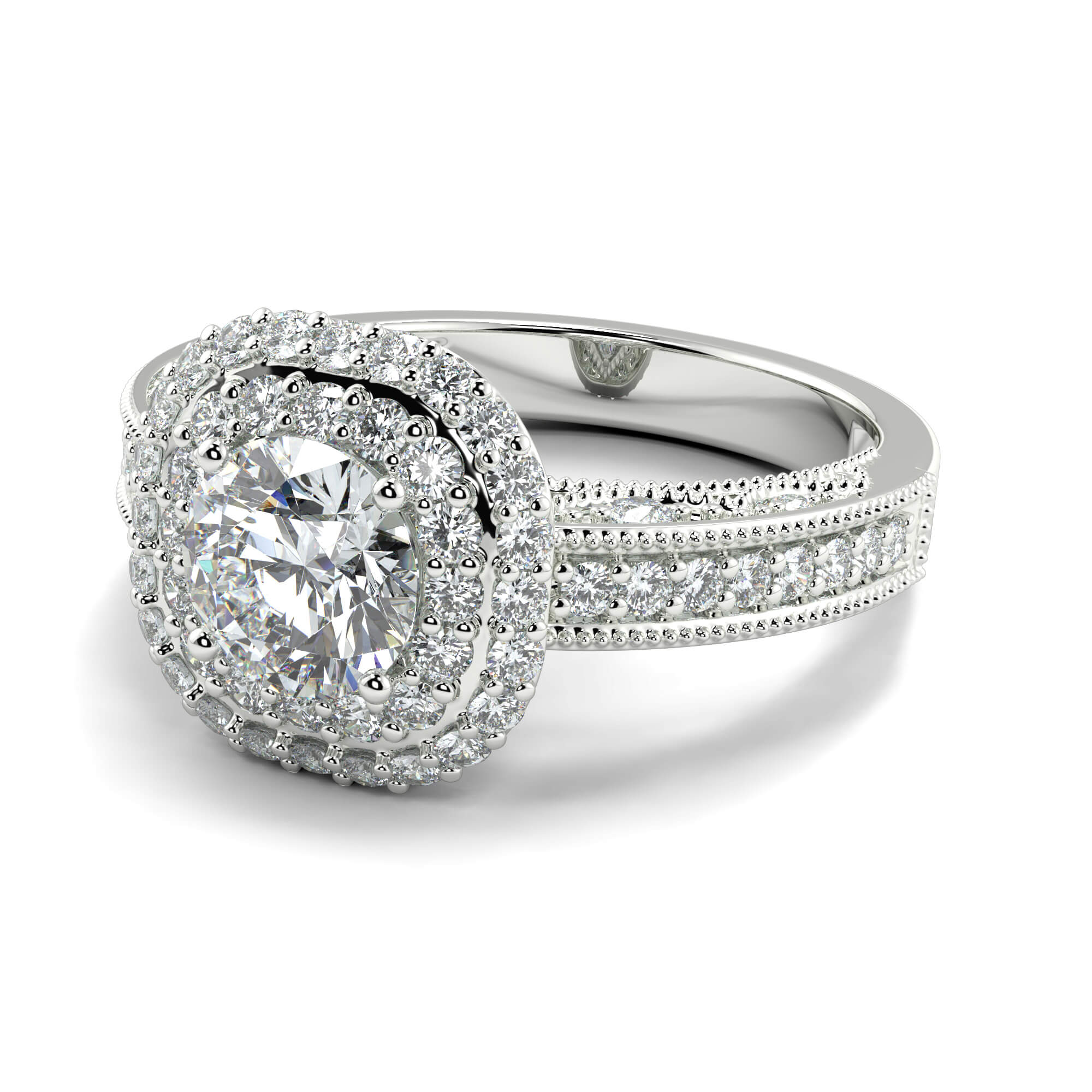 This sparkling setting features a round double halo diamond engagement ring of beautiful scalloped pavé diamonds that encircle the center diamond and adorn the band.