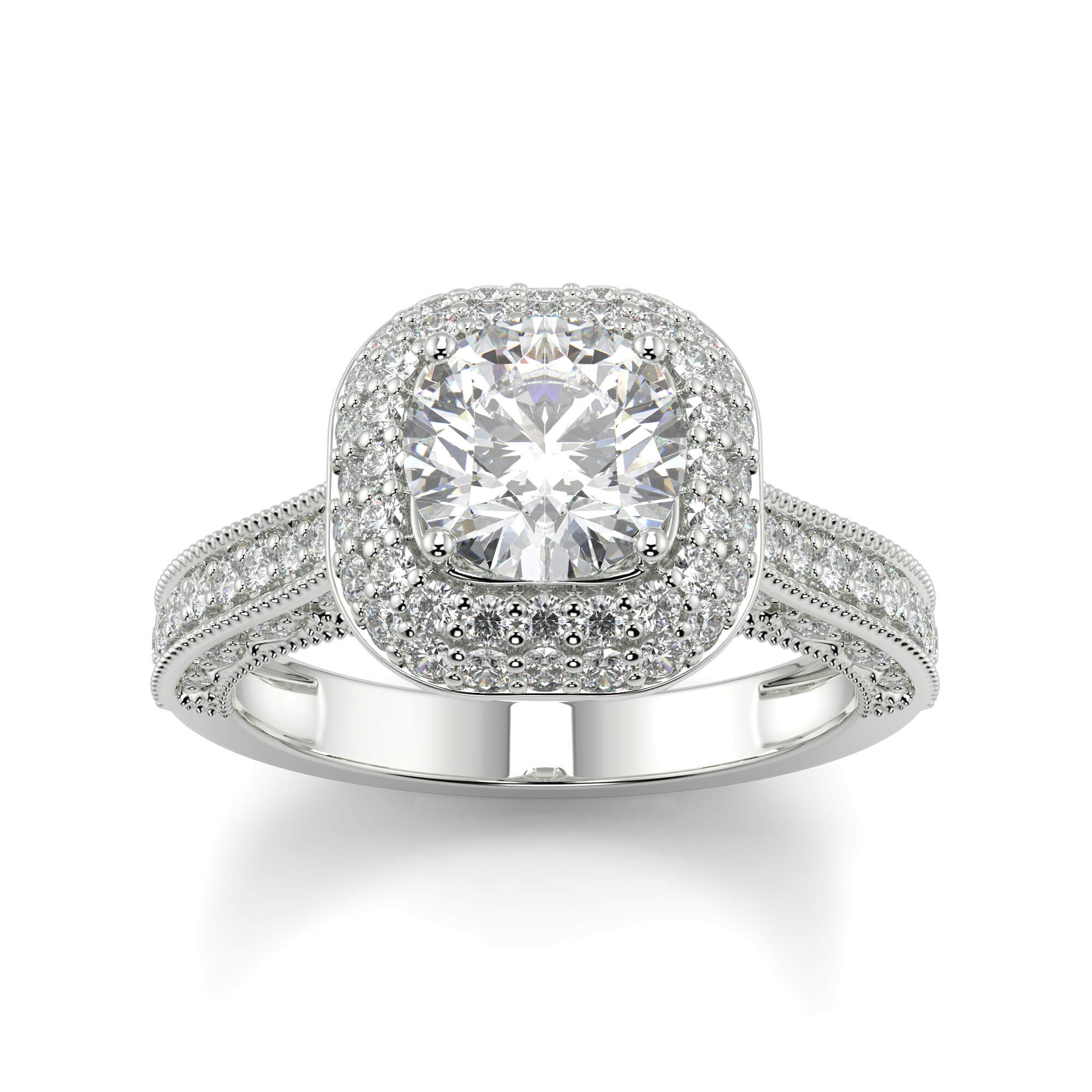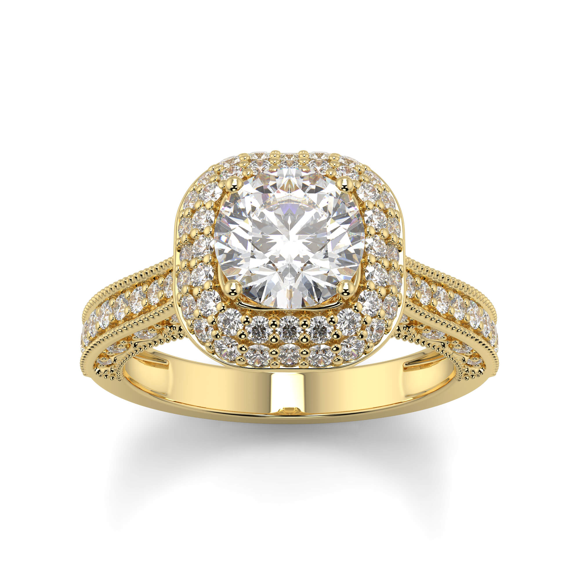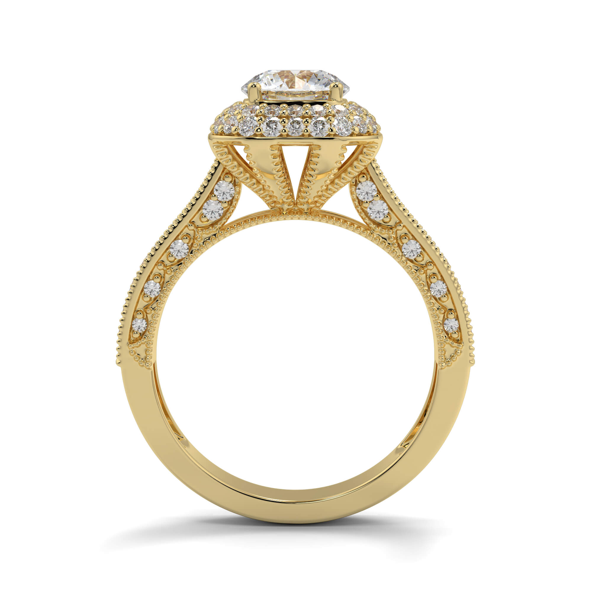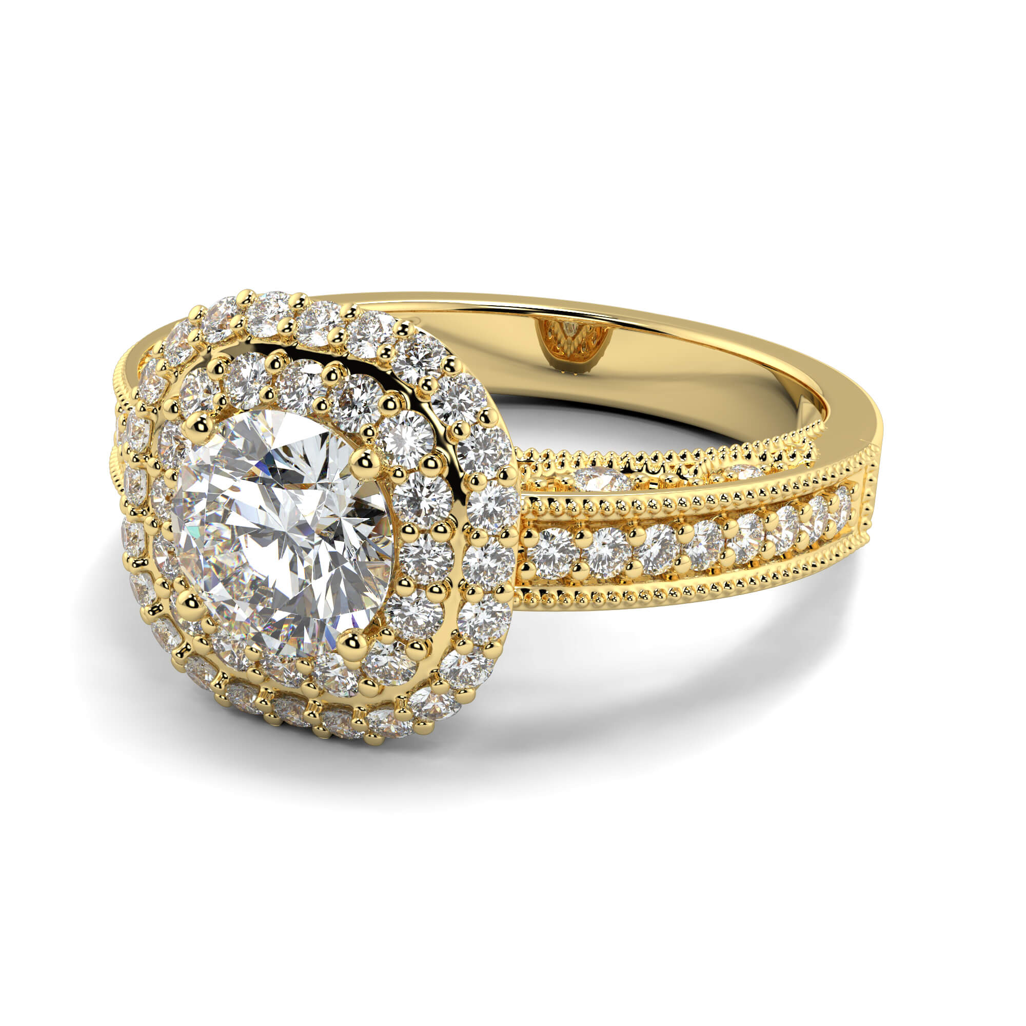 This sparkling setting features a round double halo diamond engagement ring of beautiful scalloped pavé diamonds that encircle the center diamond and adorn the band.