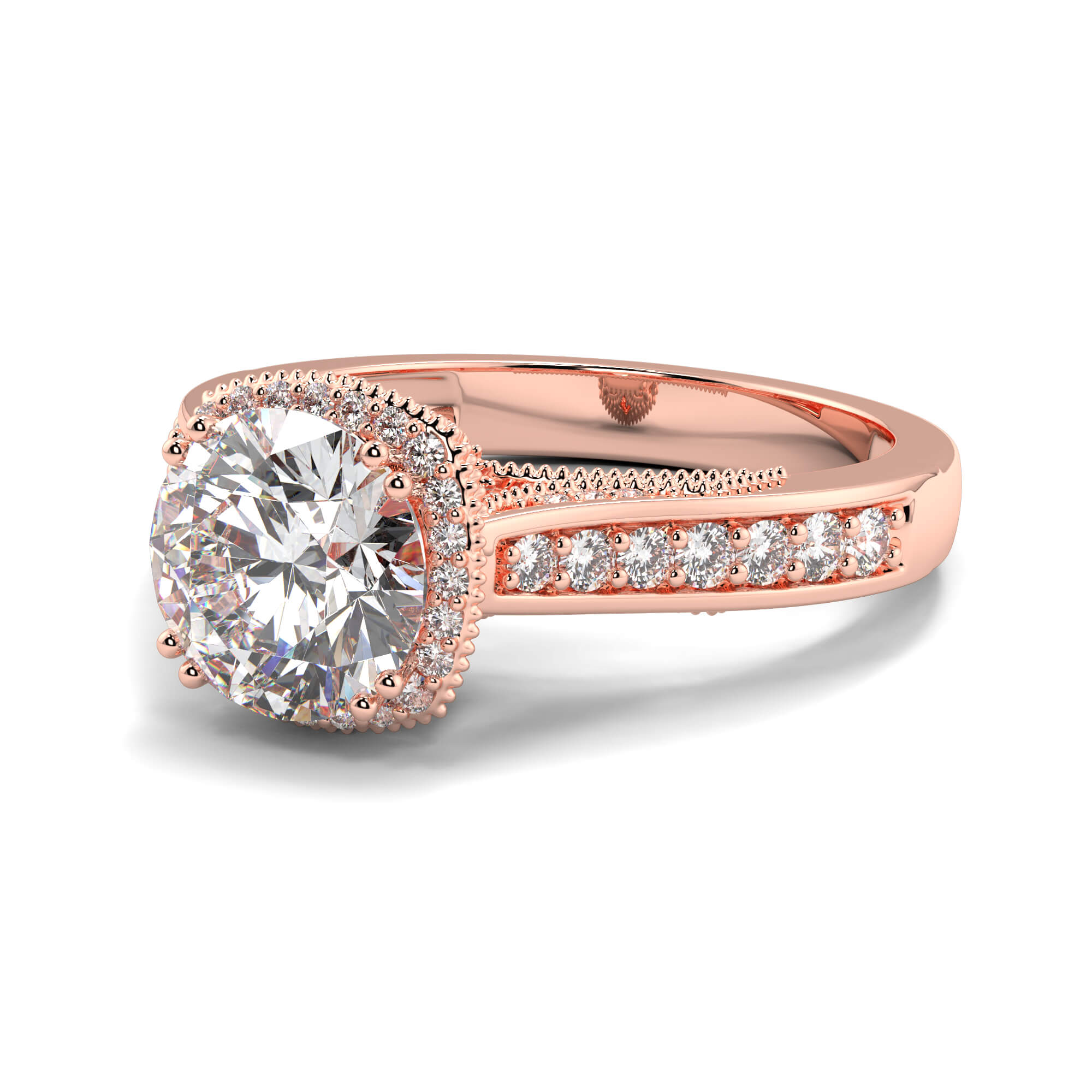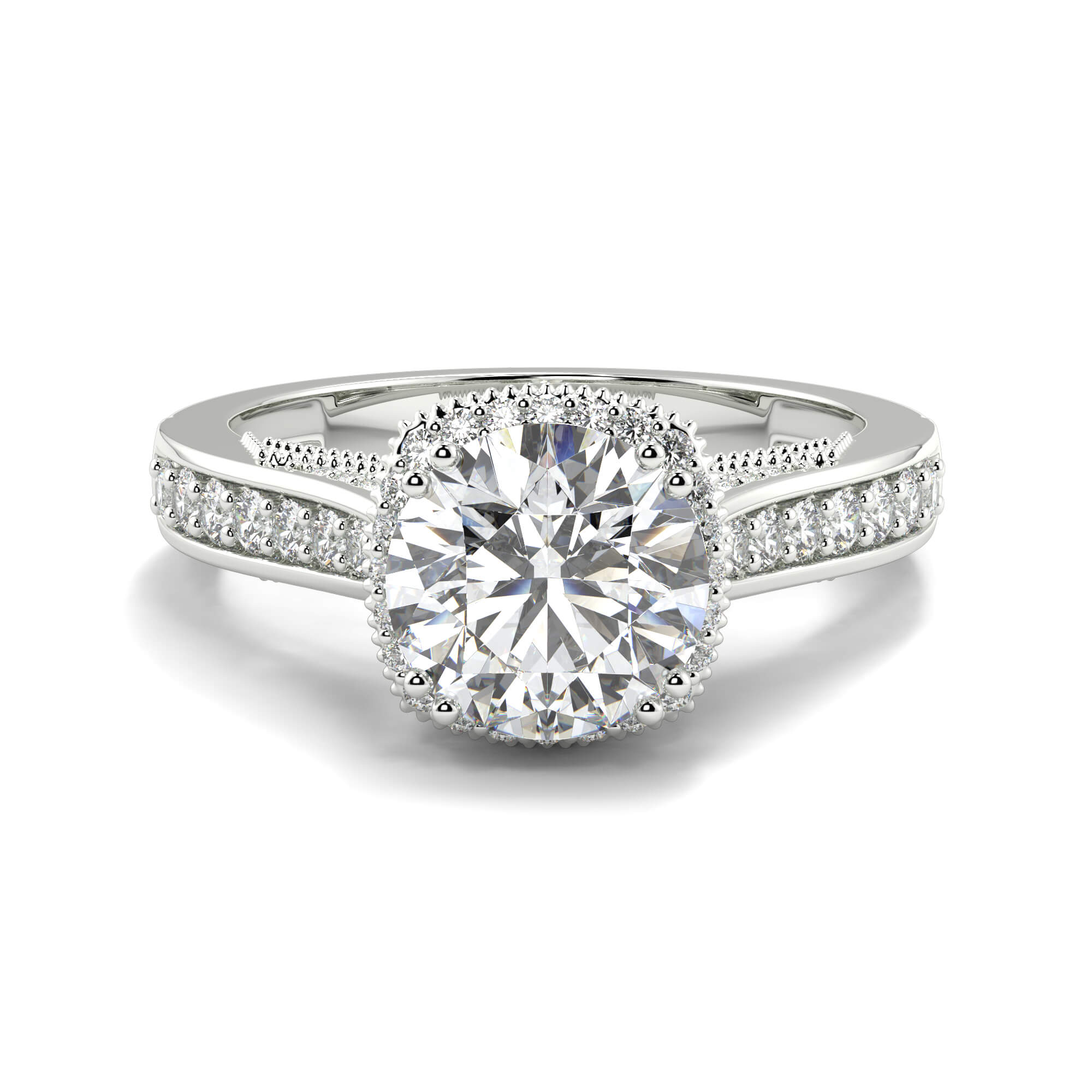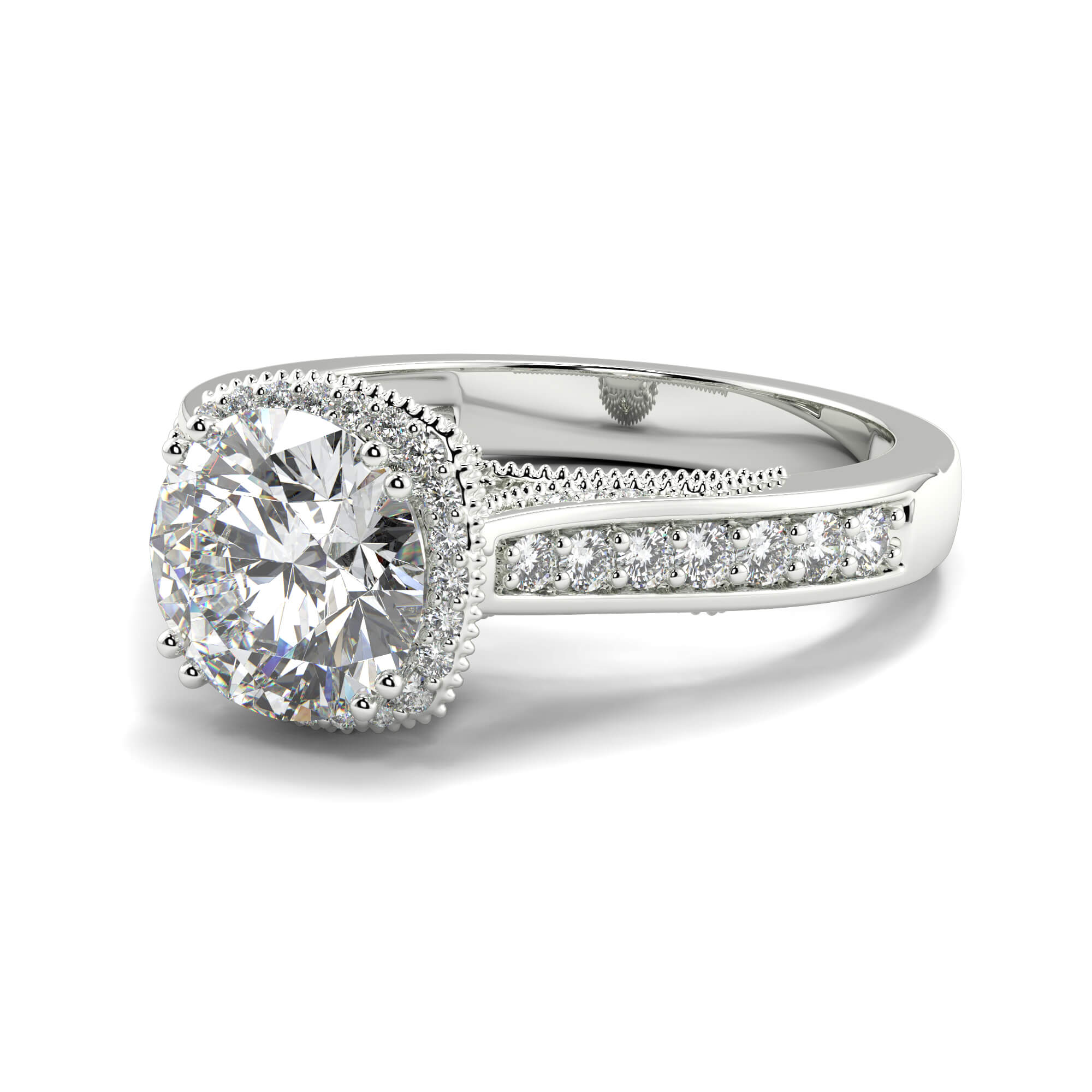 The final effect has a classic halo Solitaire diamond wedding ring elegance, and the channels of diamonds draw the eye along the ring toward the center stone.