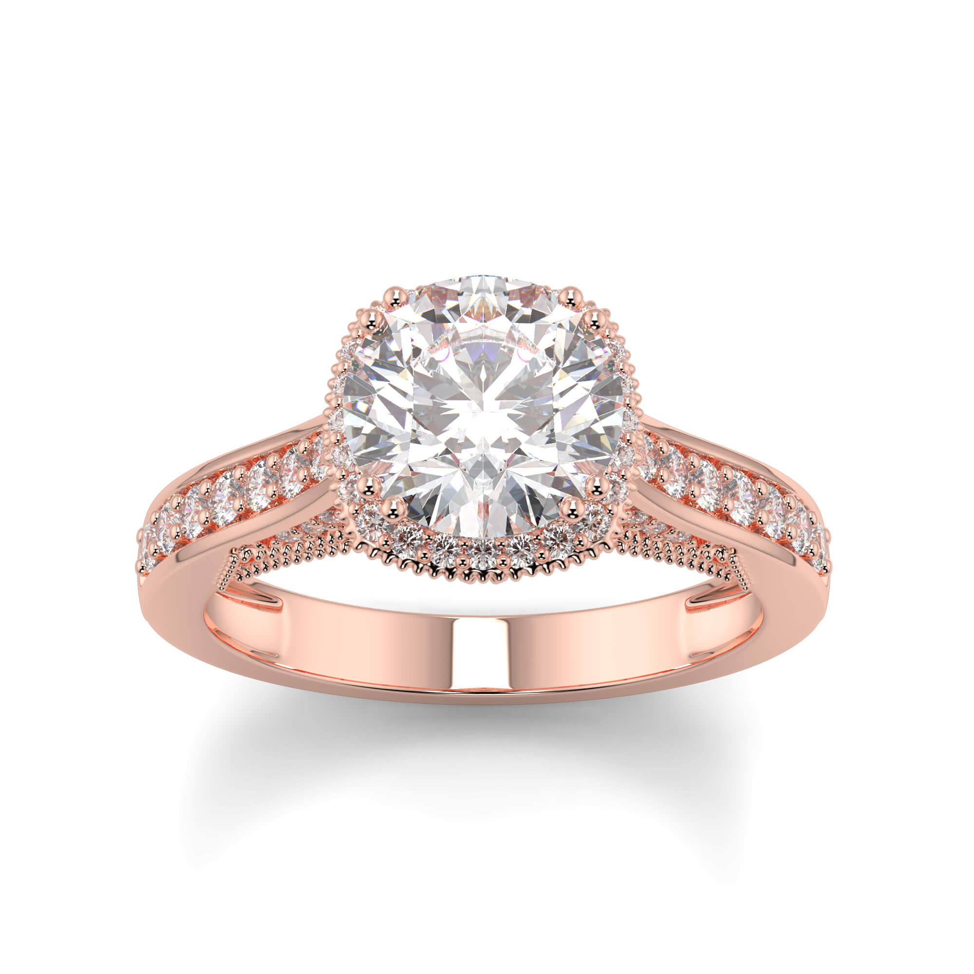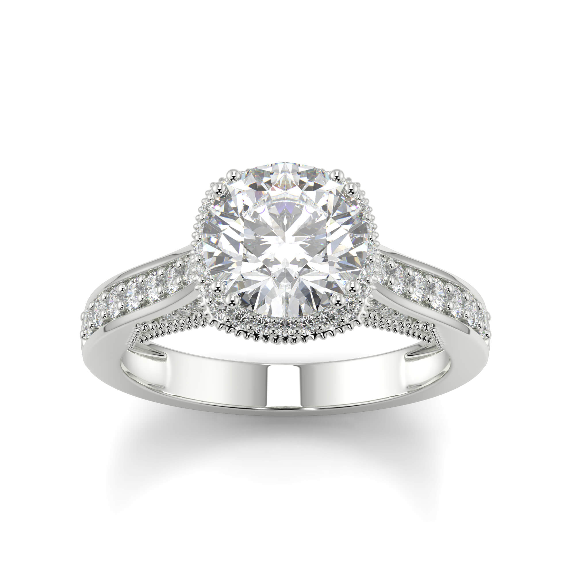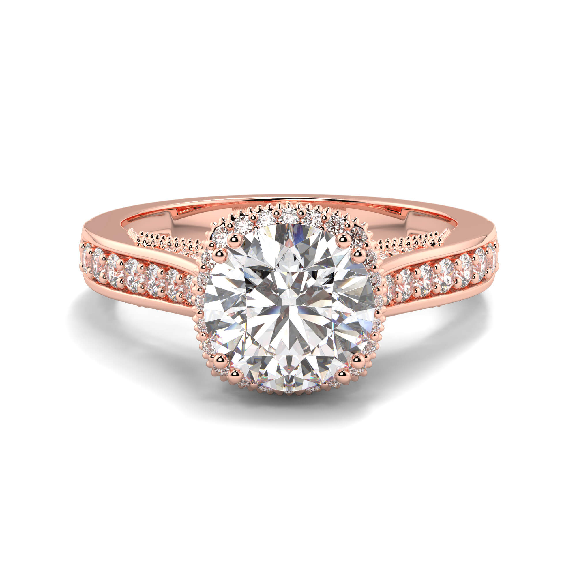 The final effect has a classic halo Solitaire diamond wedding ring elegance, and the channels of diamonds draw the eye along the ring toward the center stone.