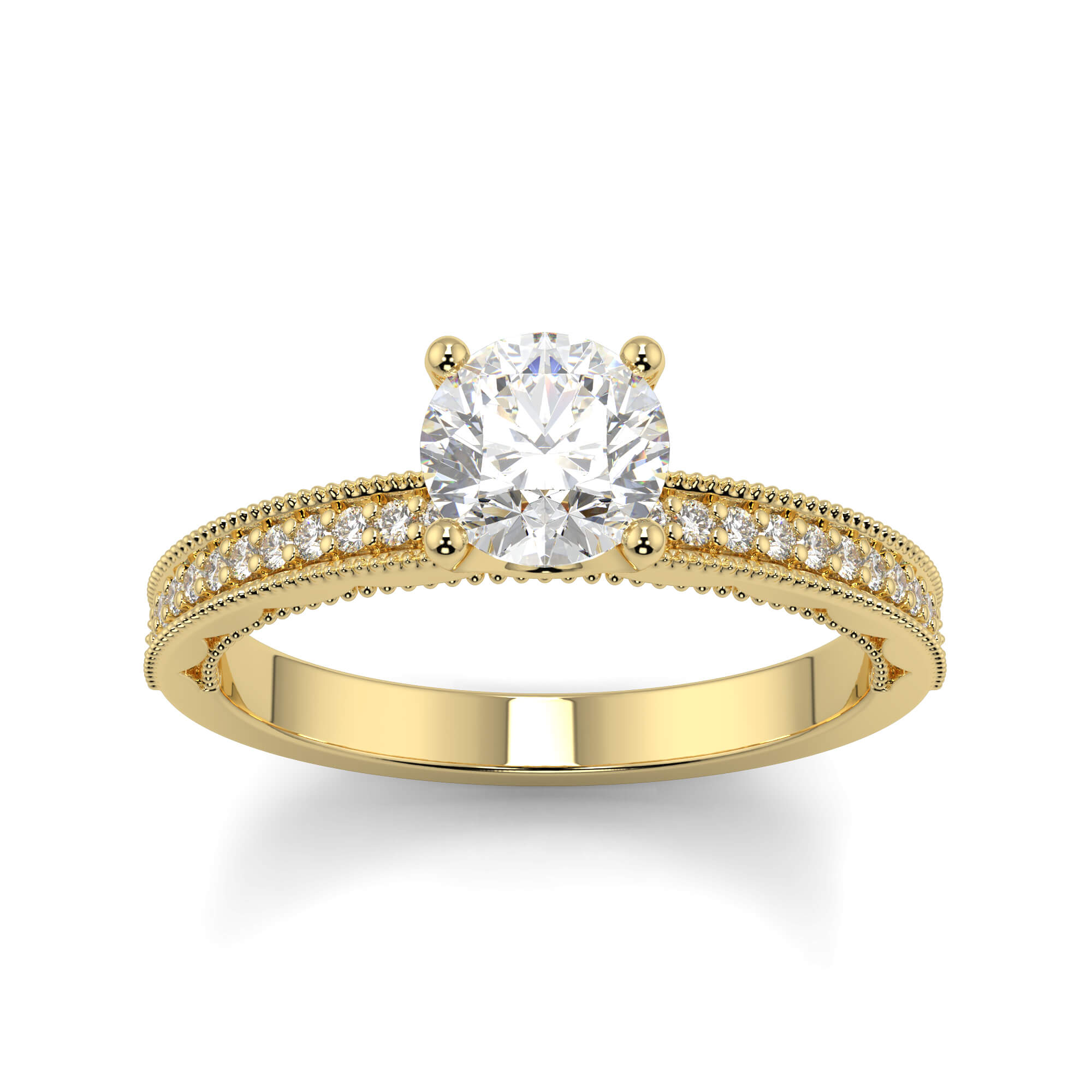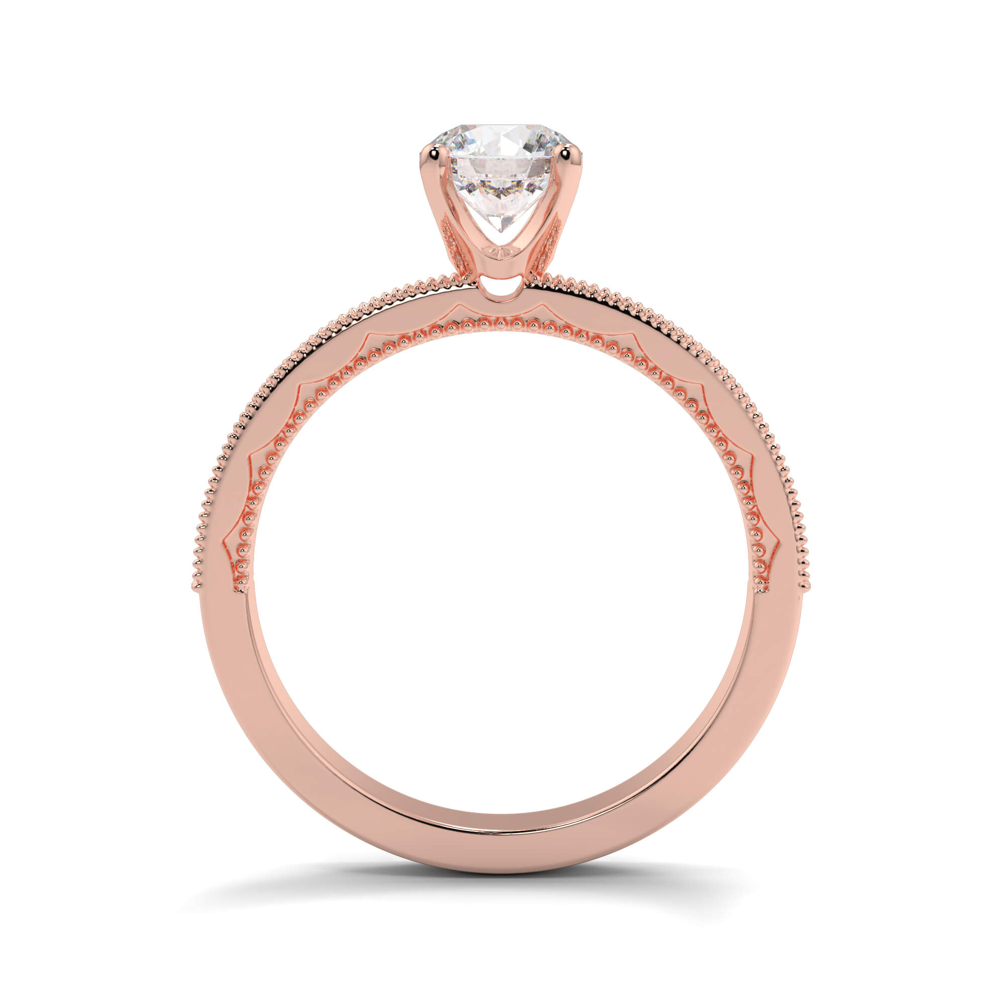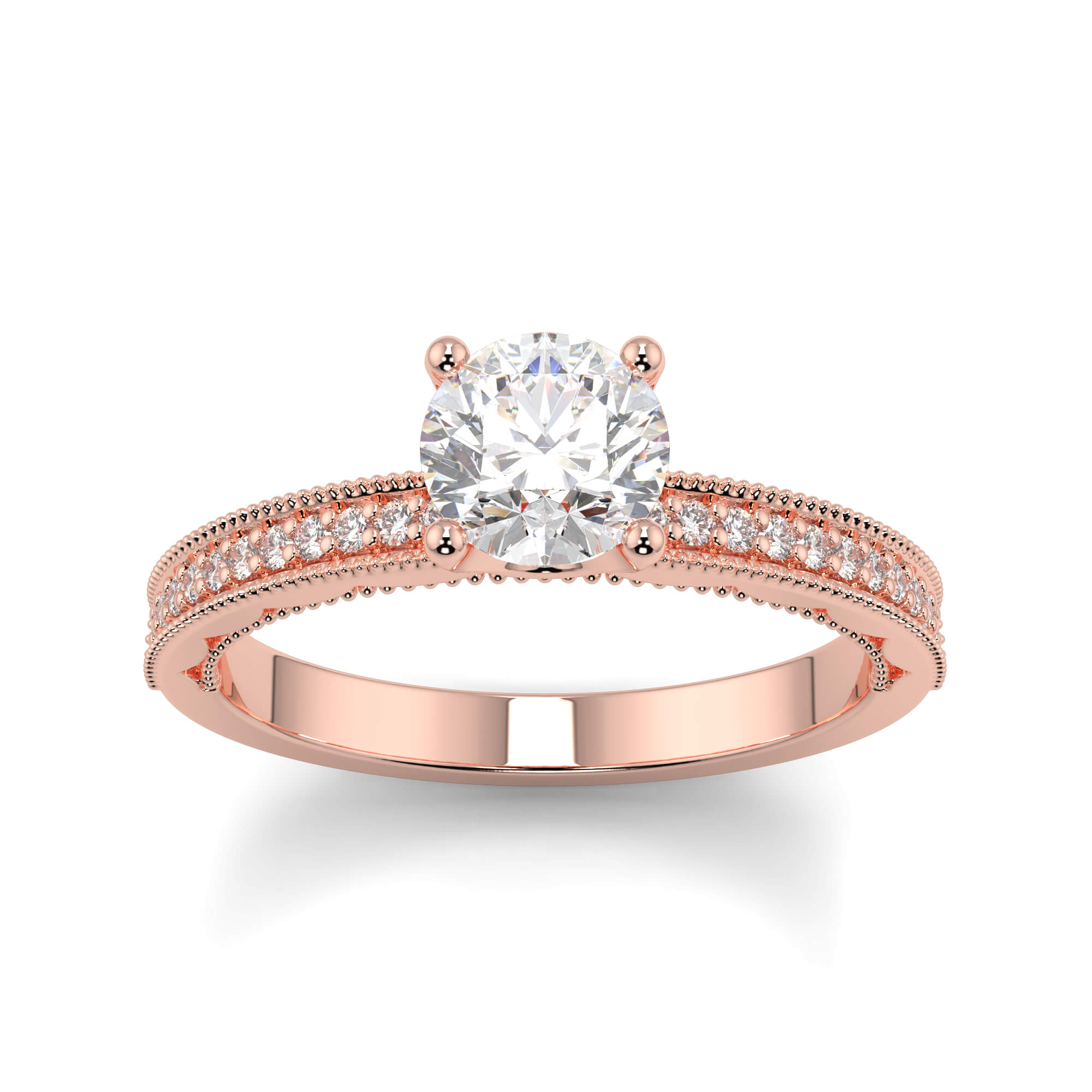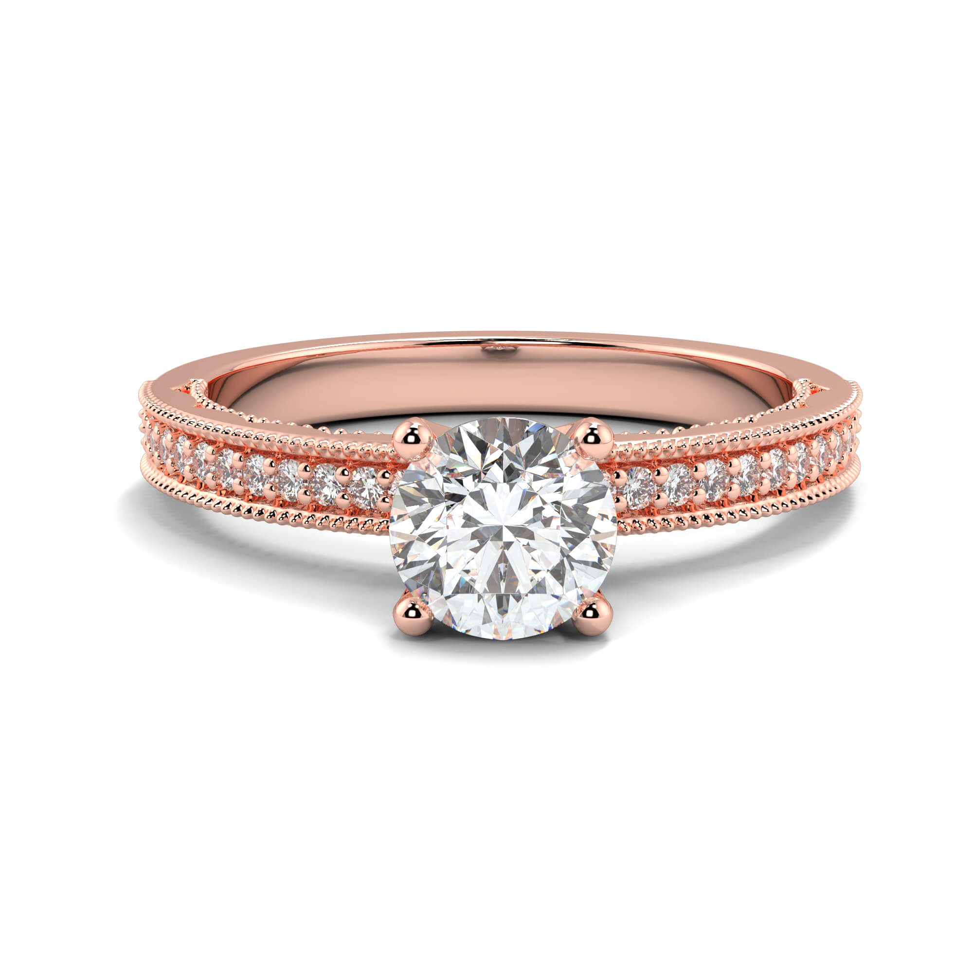 This solitaire round cut diamond 4 prong set ring features brilliant diamonds with channel-set side diamonds, set in white, rose and yellow gold.