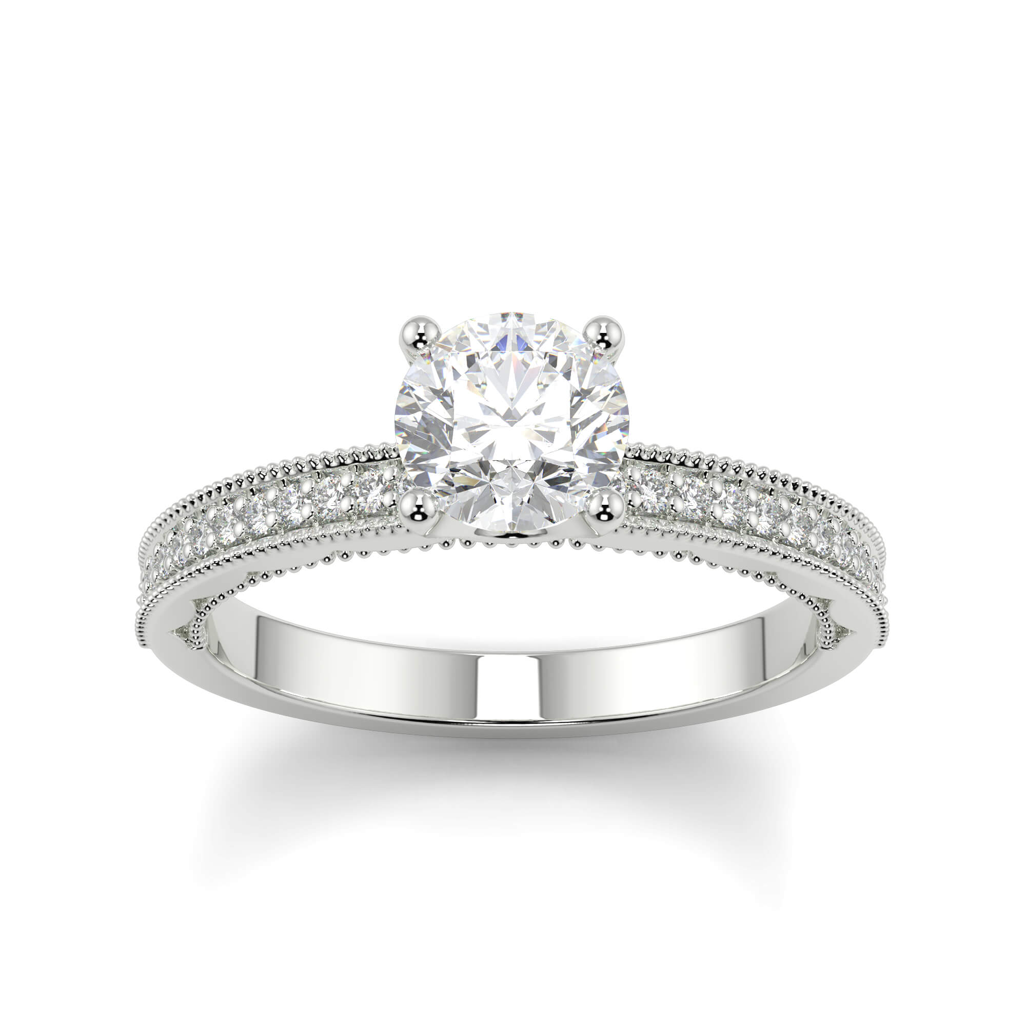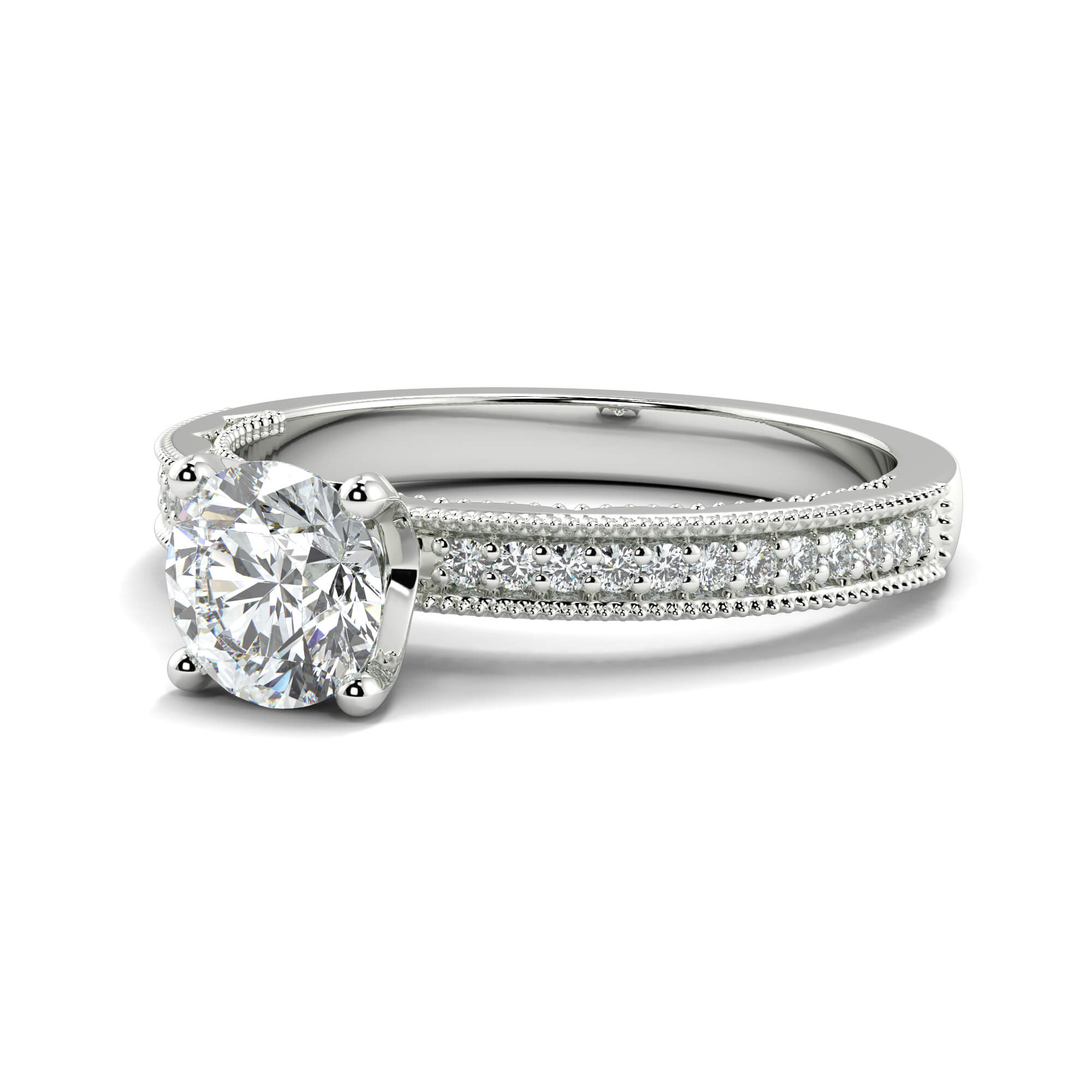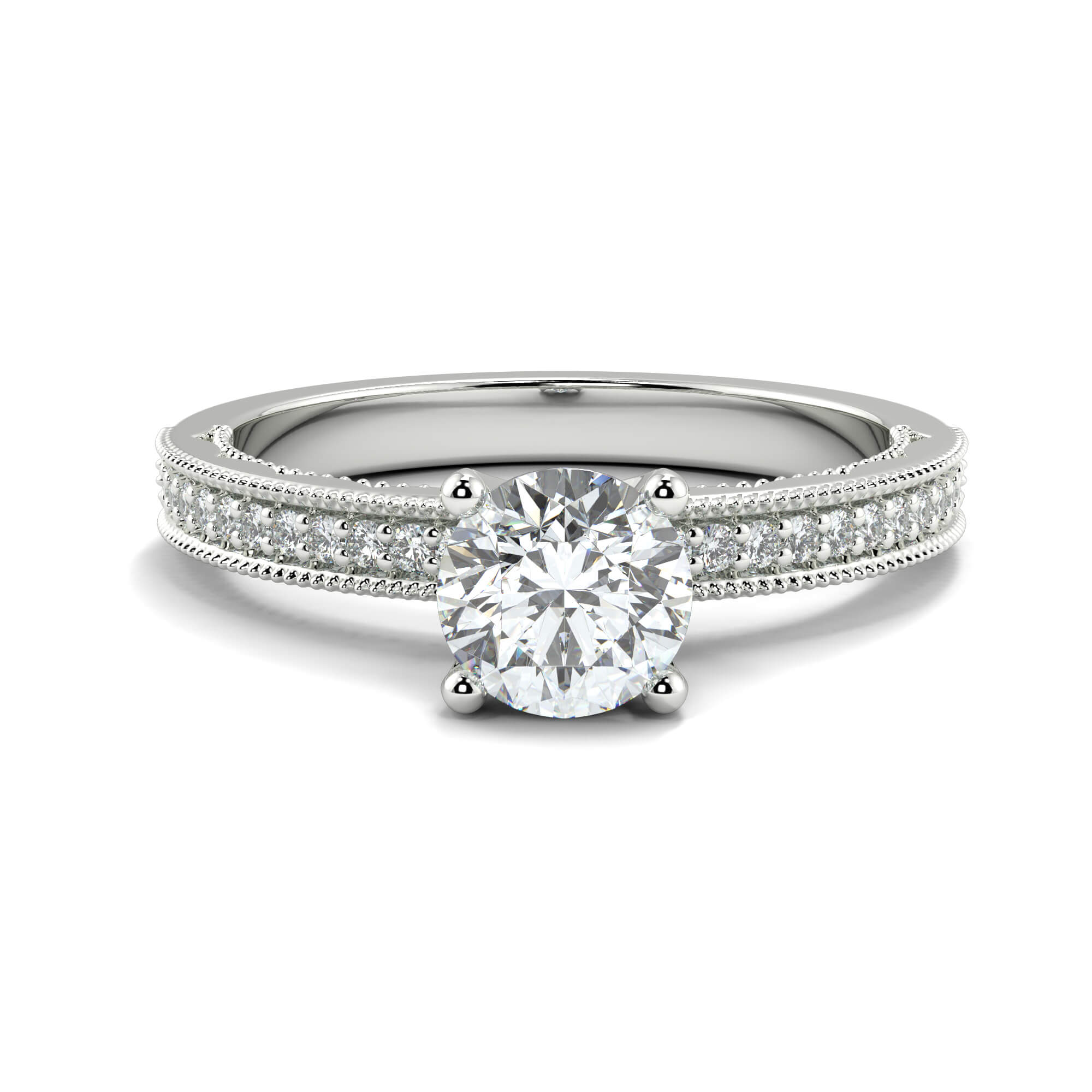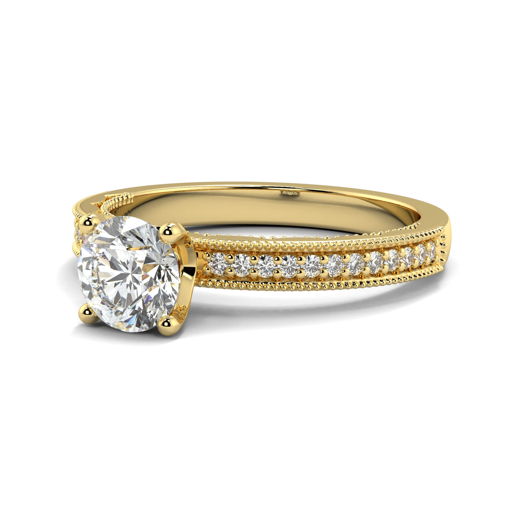 This solitaire round cut diamond 4 prong set ring features brilliant diamonds with channel-set side diamonds, set in white, rose and yellow gold.