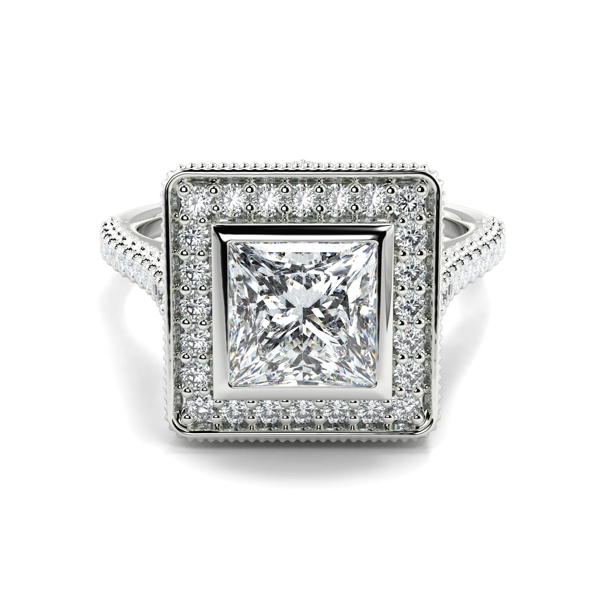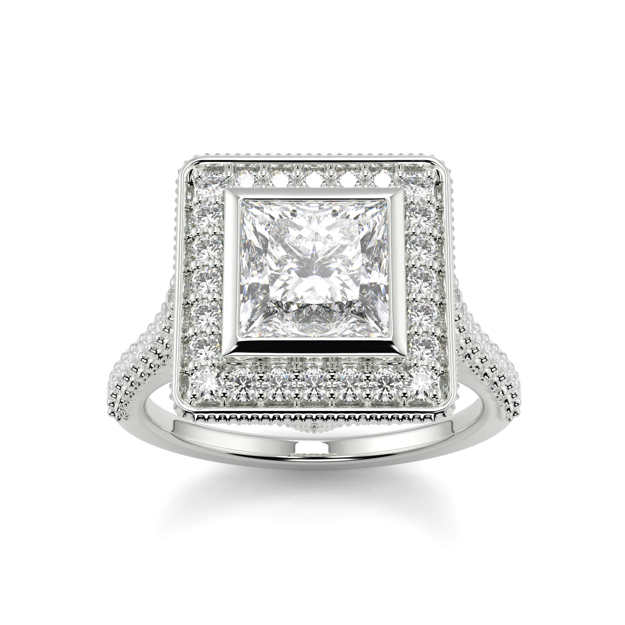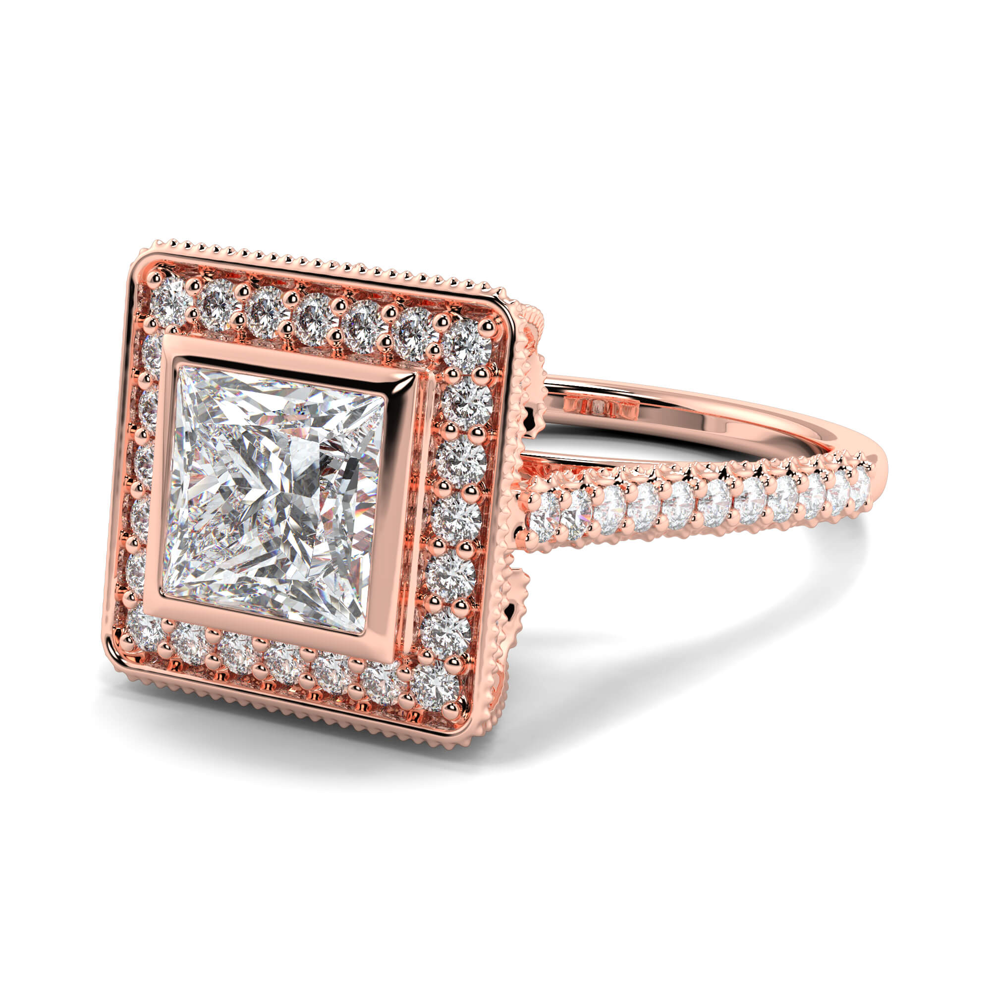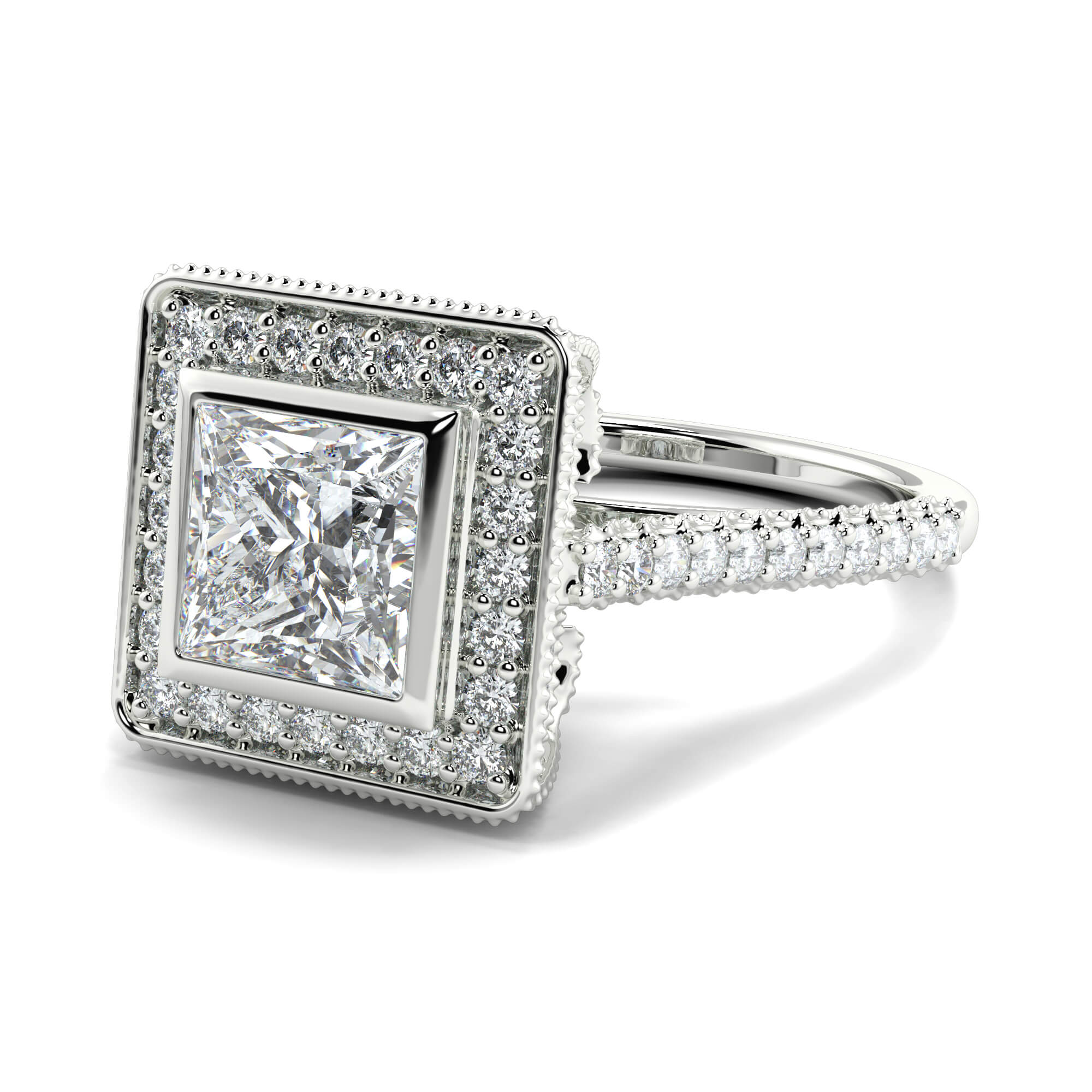 A vintage princess cut solitaire diamond ring is row of smaller pavé-set diamonds creates a border or halo around the central stone.
