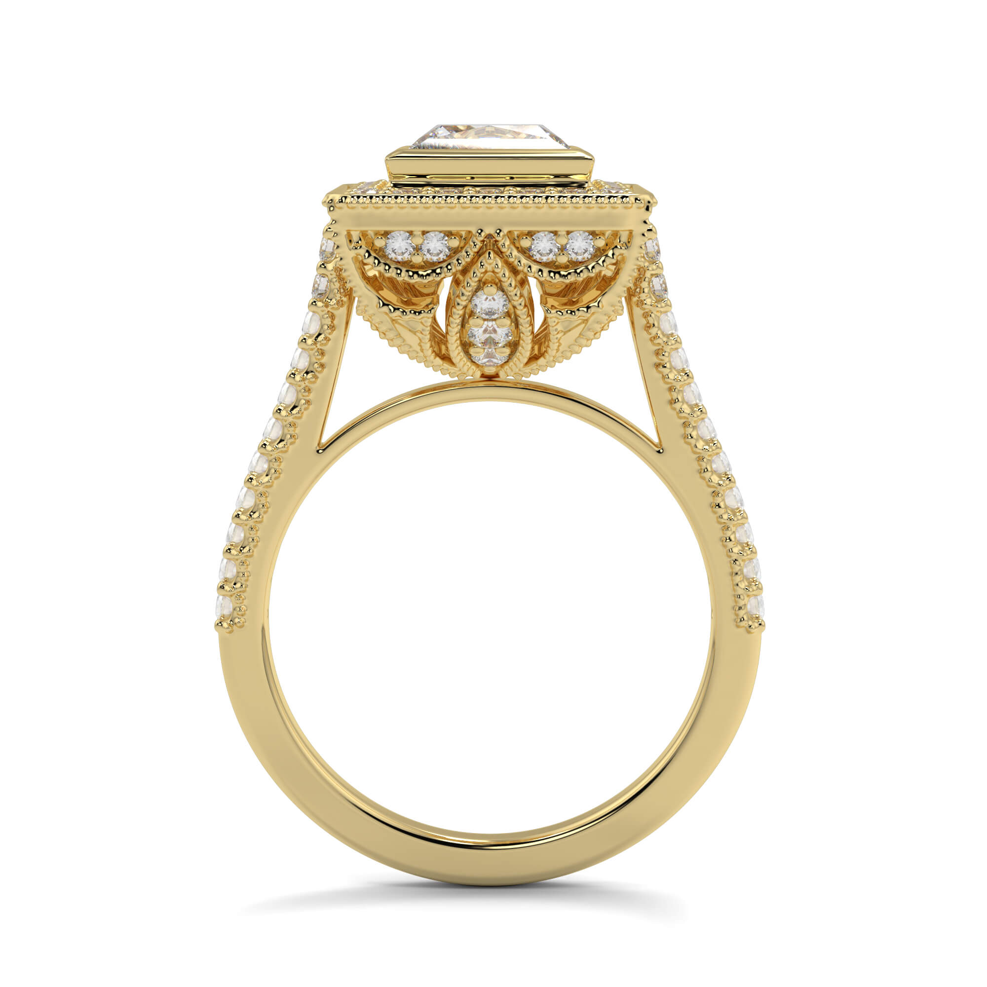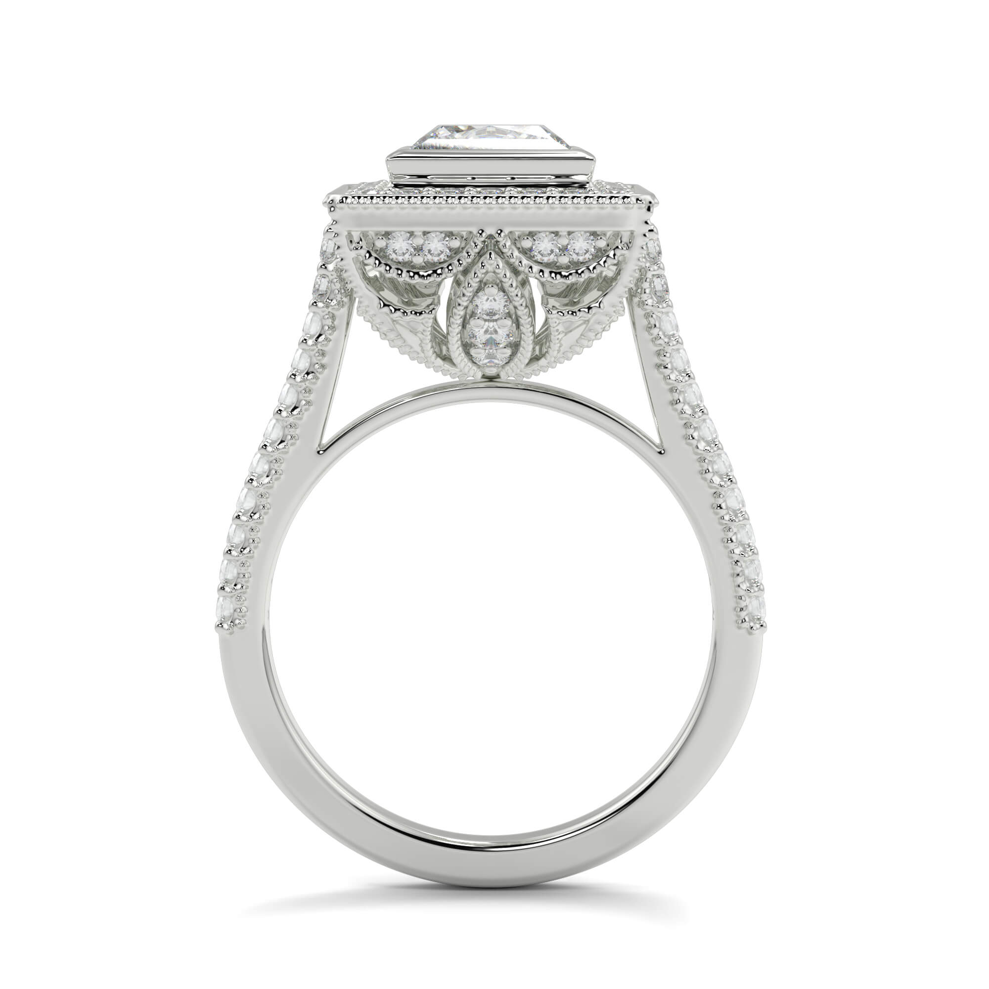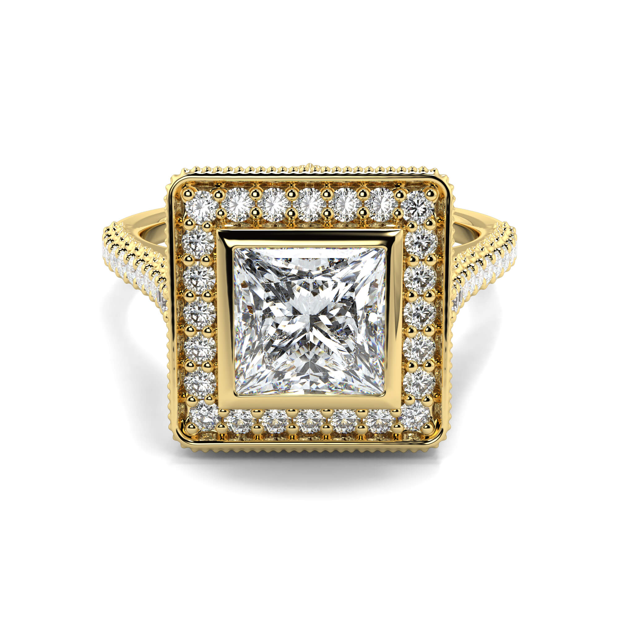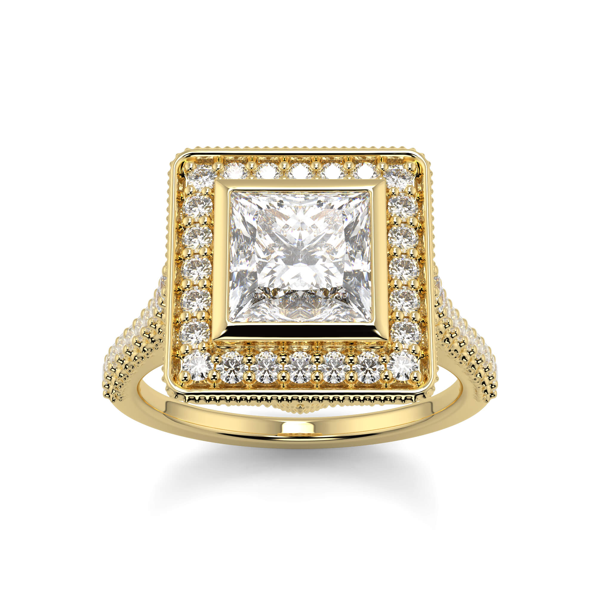A vintage princess cut solitaire diamond ring is row of smaller pavé-set diamonds creates a border or halo around the central stone.